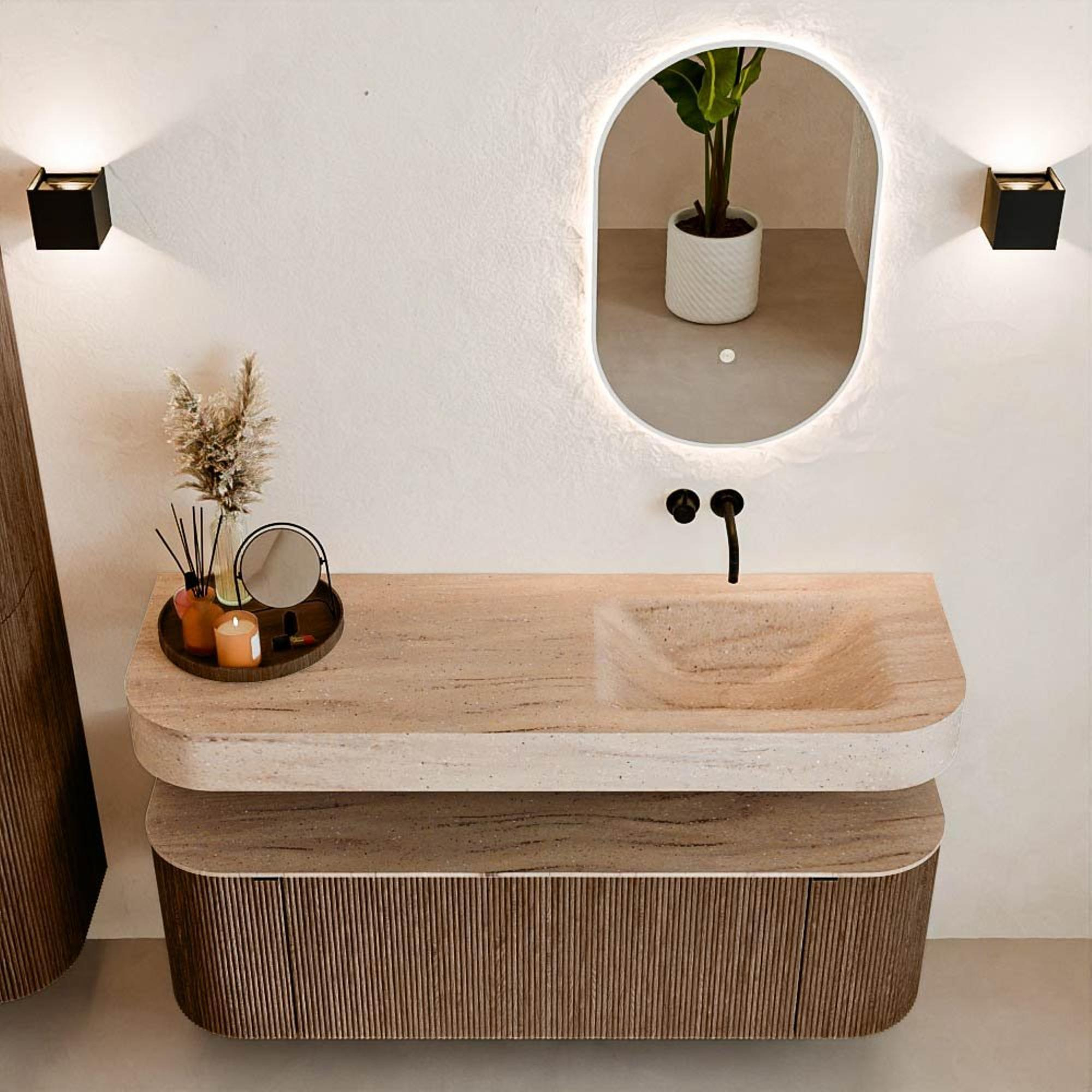 Matériaux naturels dans des tons chauds. Les cannelures verticales apportent rythme et texture au design, tandis que le chêne confère une apparence chaleureuse et artisanale. Choisissez parmi 5 teintes de bois OAK, WALNUT, DUSK, SHADOW et RUBY, des couleurs de bois soigneusement sélectionnées pour enrichir les salles de bains modernes et classiques.