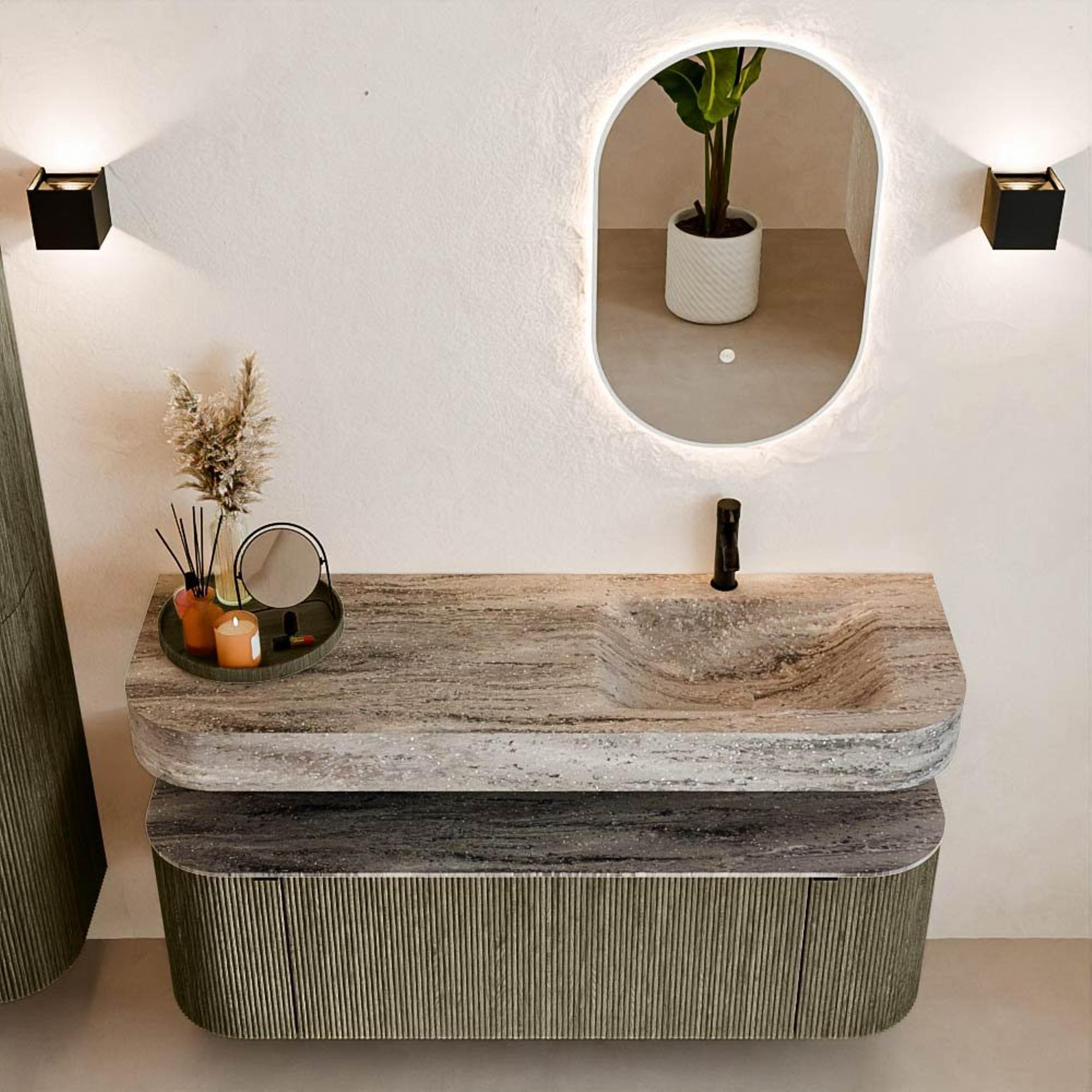 Matériaux naturels dans des tons chauds. Les nervures verticales apportent rythme et texture au design, tandis que le chêne confère une apparence chaleureuse et artisanale. Choisissez parmi 5 teintes de bois OAK, WALNUT, DUSK, SHADOW et RUBY, des couleurs de bois soigneusement sélectionnées pour enrichir les salles de bains modernes et classiques.
