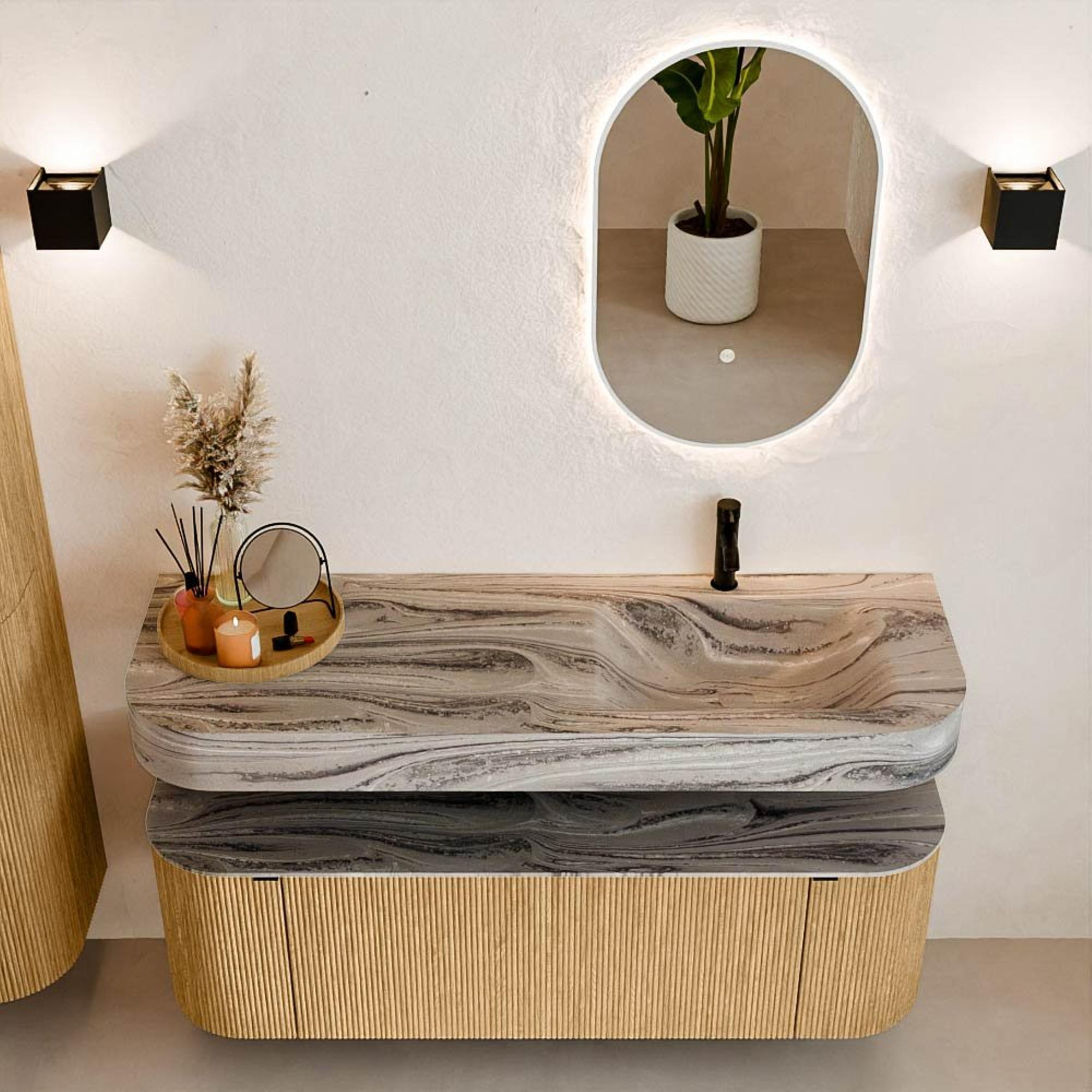 Matériaux naturels dans des tons chauds. Les rainures verticales apportent rythme et texture au design, tandis que le chêne confère une apparence chaleureuse et artisanale. Choisissez parmi 5 teintes de bois OAK, WALNUT, DUSK, SHADOW et RUBY, des couleurs de bois soigneusement sélectionnées pour enrichir les salles de bains modernes et classiques.
