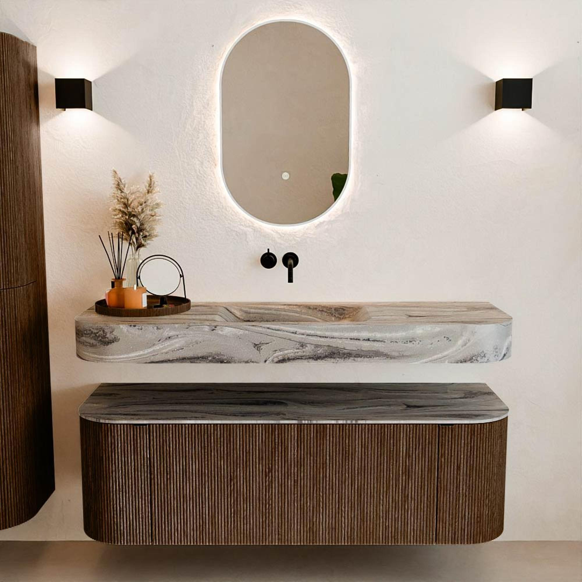 Matériaux naturels dans des tons chauds. Les cannelures verticales apportent rythme et texture au design, tandis que le chêne confère une apparence chaleureuse et artisanale. Choisissez parmi 5 teintes de bois OAK, WALNUT, DUSK, SHADOW et RUBY, des couleurs de bois soigneusement sélectionnées pour enrichir les salles de bains modernes et classiques.