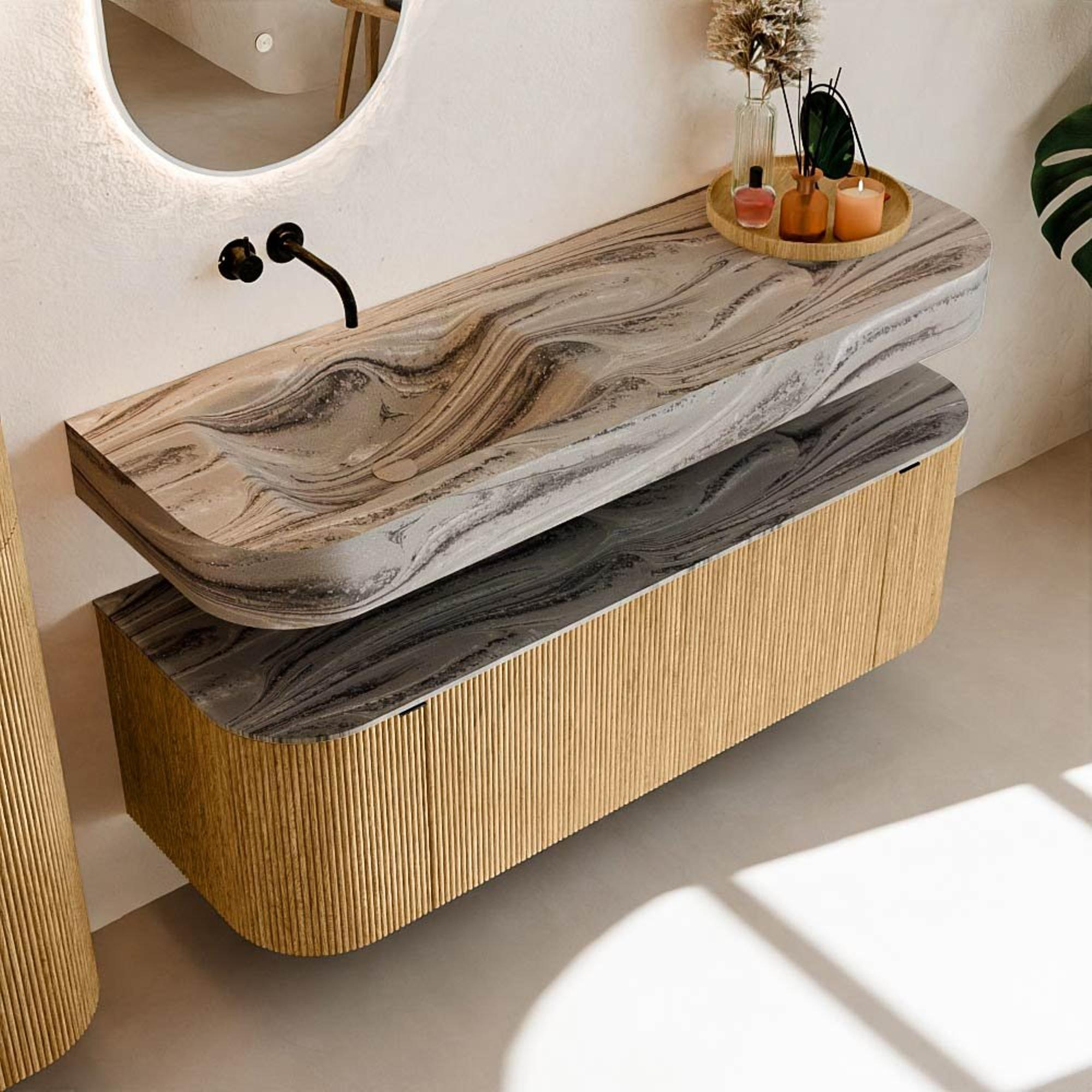 Au-dessus du meuble flotte une vasque suspendue assortie aux coins arrondis – parfaitement adaptée à la forme du meuble. La vasque est réalisée en Solid Surface et suit subtilement les lignes du meuble inférieur, créant un ensemble harmonieux. Le plan de travail en Solid Surface forme une base solide, facile d'entretien, et complète la combinaison.