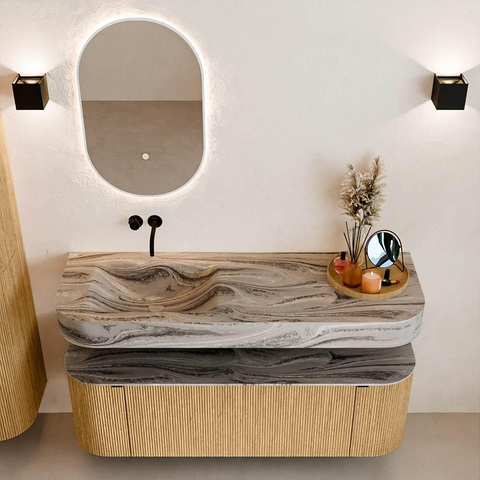 Matériaux naturels aux teintes chaudes. Les nervures verticales apportent rythme et texture au design, tandis que le chêne confère une apparence chaleureuse et artisanale. Choisissez parmi 5 teintes de bois OAK, WALNUT, DUSK, SHADOW et RUBY, des couleurs de bois soigneusement sélectionnées pour enrichir les salles de bains modernes et classiques.