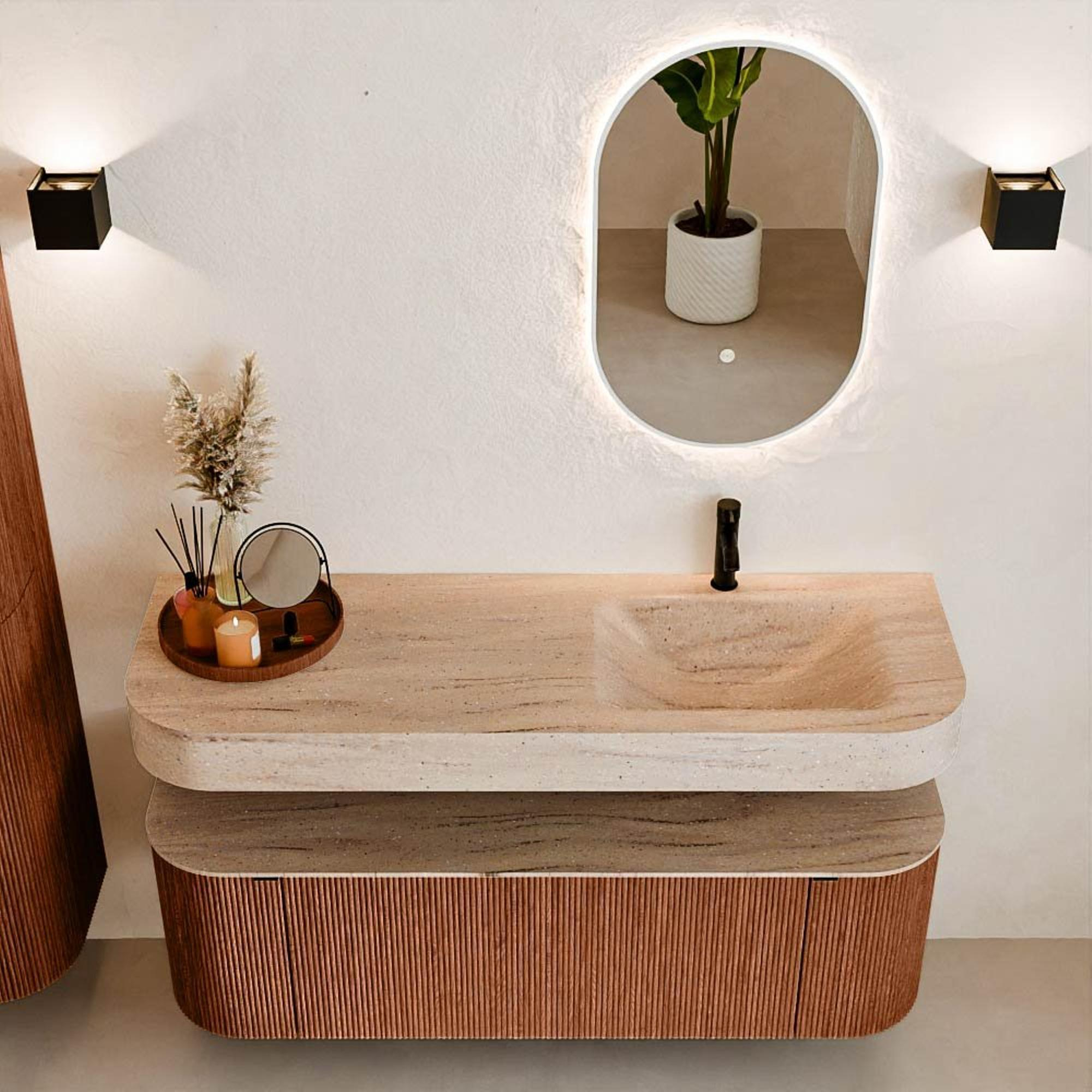 Matériaux naturels dans des tons chauds. Les nervures verticales apportent rythme et texture au design, tandis que le chêne confère une apparence chaleureuse et artisanale. Choisissez parmi 5 teintes de bois OAK, WALNUT, DUSK, SHADOW et RUBY, des couleurs de bois soigneusement sélectionnées pour enrichir les salles de bains modernes et classiques.