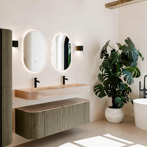 Matériaux naturels dans des tons chauds. Les nervures verticales apportent rythme et texture au design, tandis que le chêne confère une apparence chaleureuse et artisanale. Choisissez parmi 5 teintes de bois OAK, WALNUT, DUSK, SHADOW et RUBY, des couleurs de bois soigneusement sélectionnées pour enrichir les salles de bains modernes et classiques.