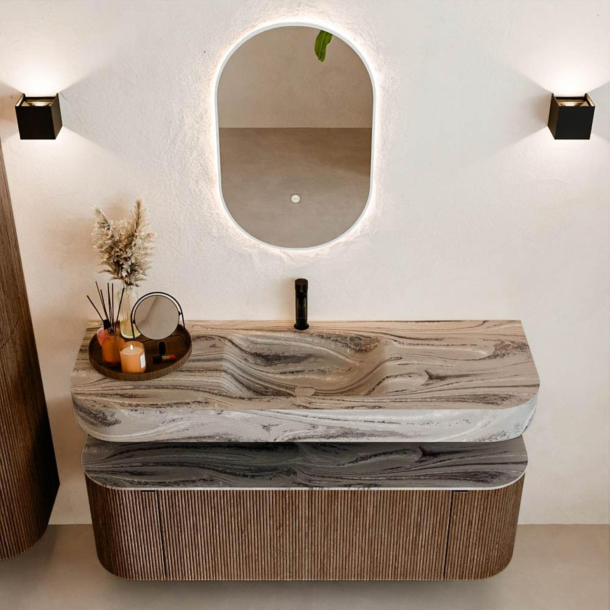 Matériaux naturels dans des tons chauds. Les nervures verticales apportent rythme et texture au design, tandis que le chêne confère une apparence chaleureuse et artisanale. Choisissez parmi 5 teintes de bois OAK, WALNUT, DUSK, SHADOW et RUBY, des couleurs de bois soigneusement sélectionnées pour enrichir les salles de bains modernes et classiques.
