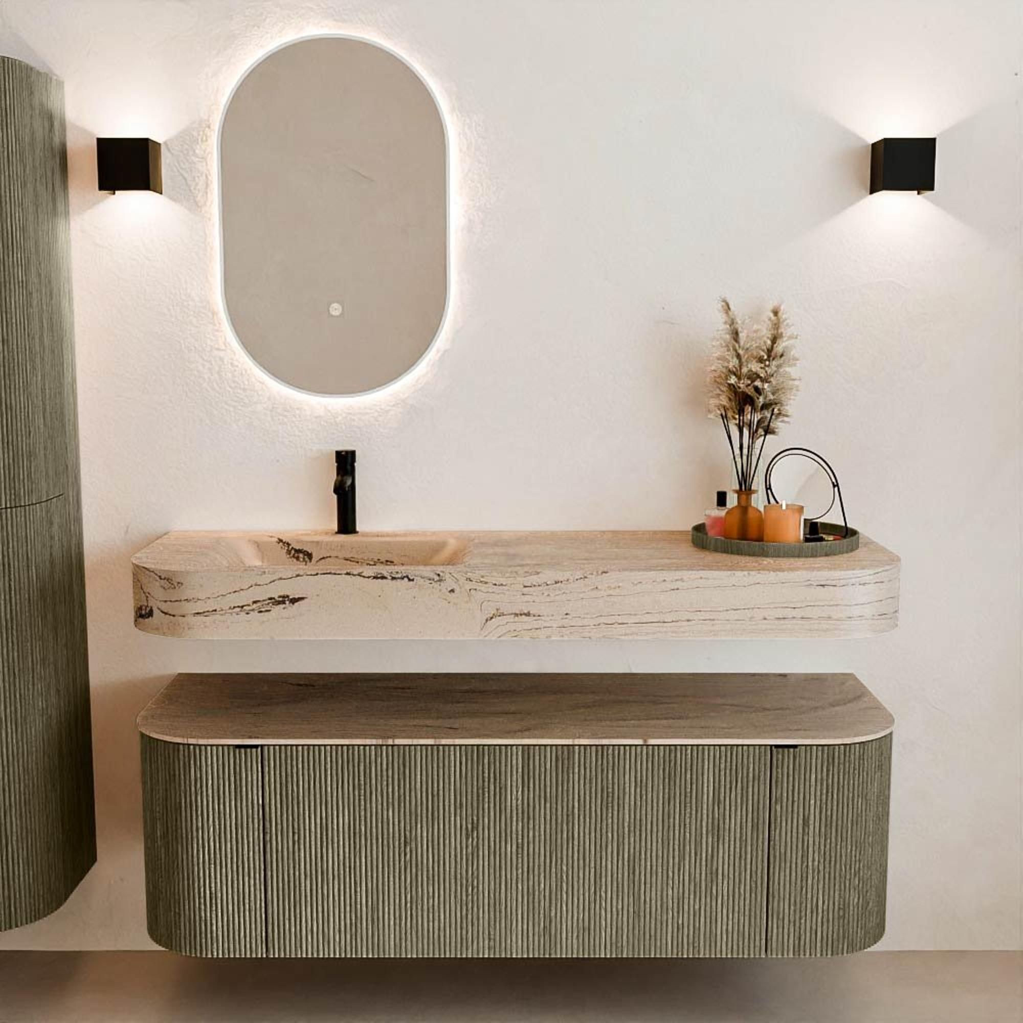 Matériaux naturels dans des tons chauds. Les nervures verticales apportent rythme et texture au design, tandis que le chêne confère une apparence chaleureuse et artisanale. Choisissez parmi 5 teintes de bois OAK, WALNUT, DUSK, SHADOW et RUBY, des couleurs de bois soigneusement sélectionnées pour enrichir les salles de bains modernes et classiques.