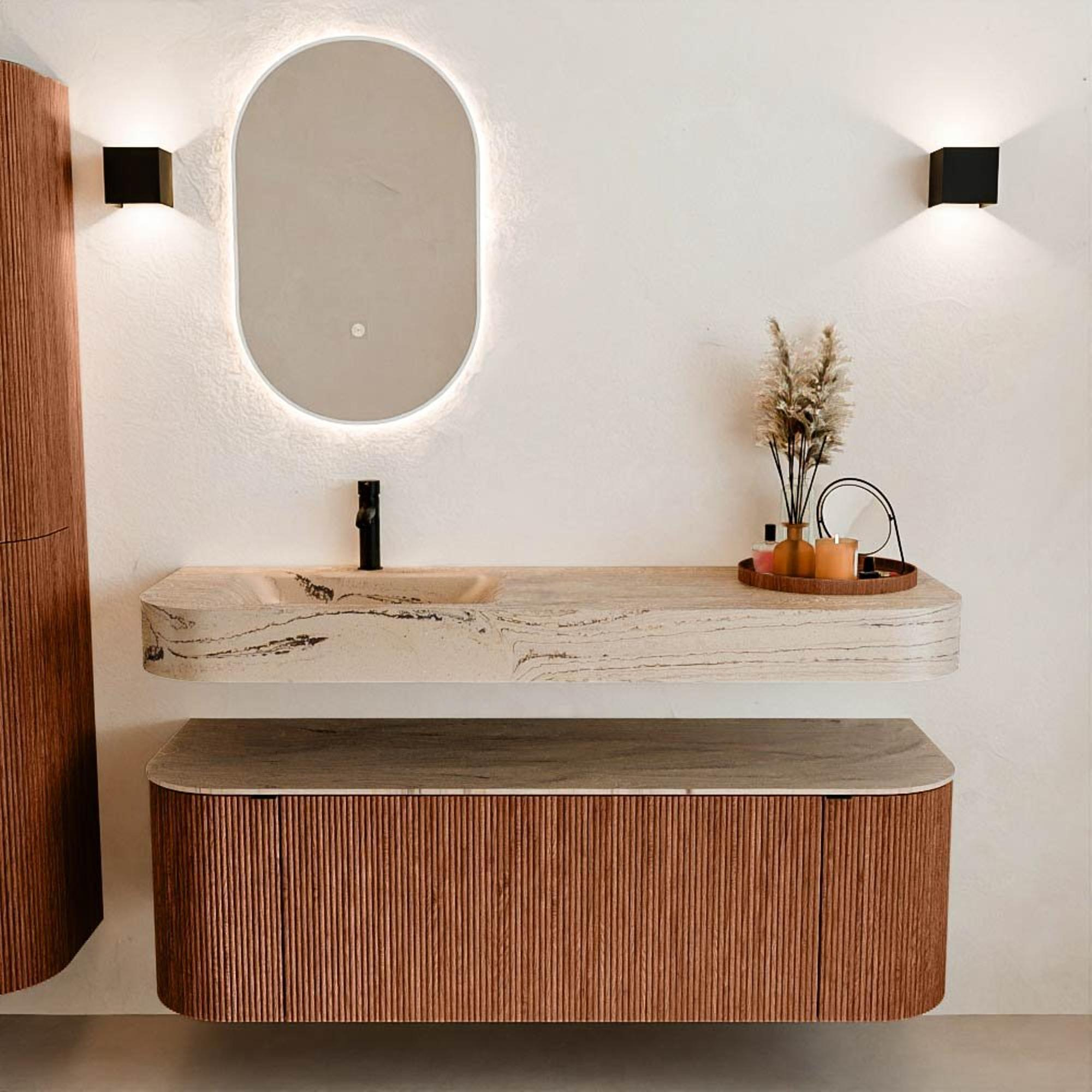Matériaux naturels dans des tons chauds. Les cannelures verticales apportent rythme et texture au design, tandis que le chêne confère une apparence chaleureuse et artisanale. Choisissez parmi 5 teintes de bois OAK, WALNUT, DUSK, SHADOW et RUBY, des couleurs de bois soigneusement sélectionnées pour enrichir les salles de bains modernes et classiques.