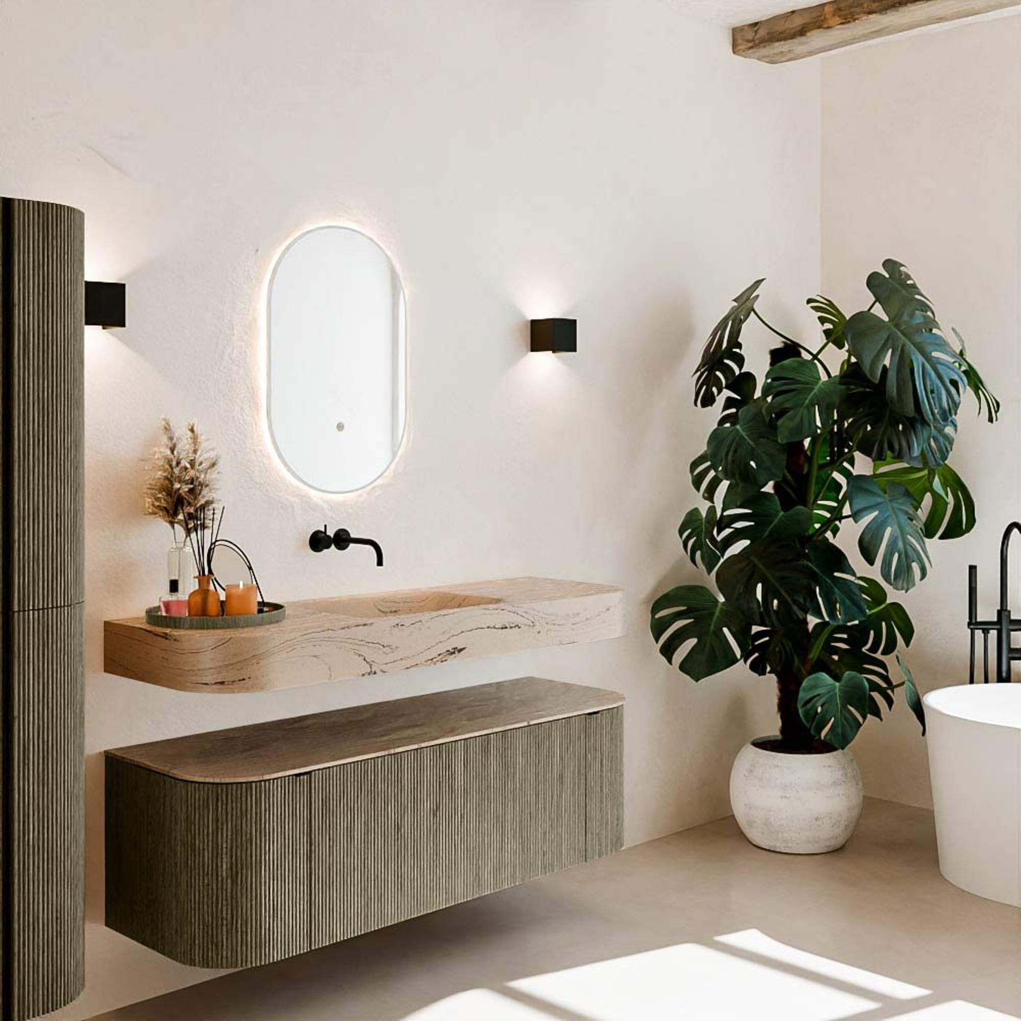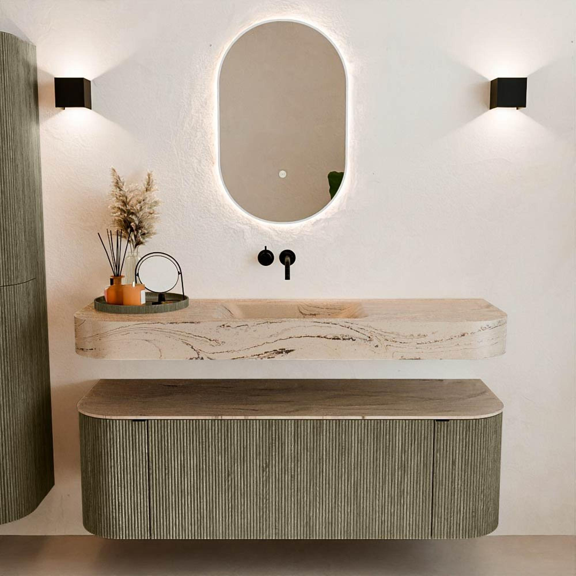 Matériaux naturels dans des tons chauds. Les cannelures verticales apportent rythme et texture au design, tandis que le chêne confère une apparence chaleureuse et artisanale. Choisissez parmi 5 teintes de bois OAK, WALNUT, DUSK, SHADOW et RUBY, des couleurs de bois soigneusement sélectionnées pour enrichir les salles de bains modernes et classiques.