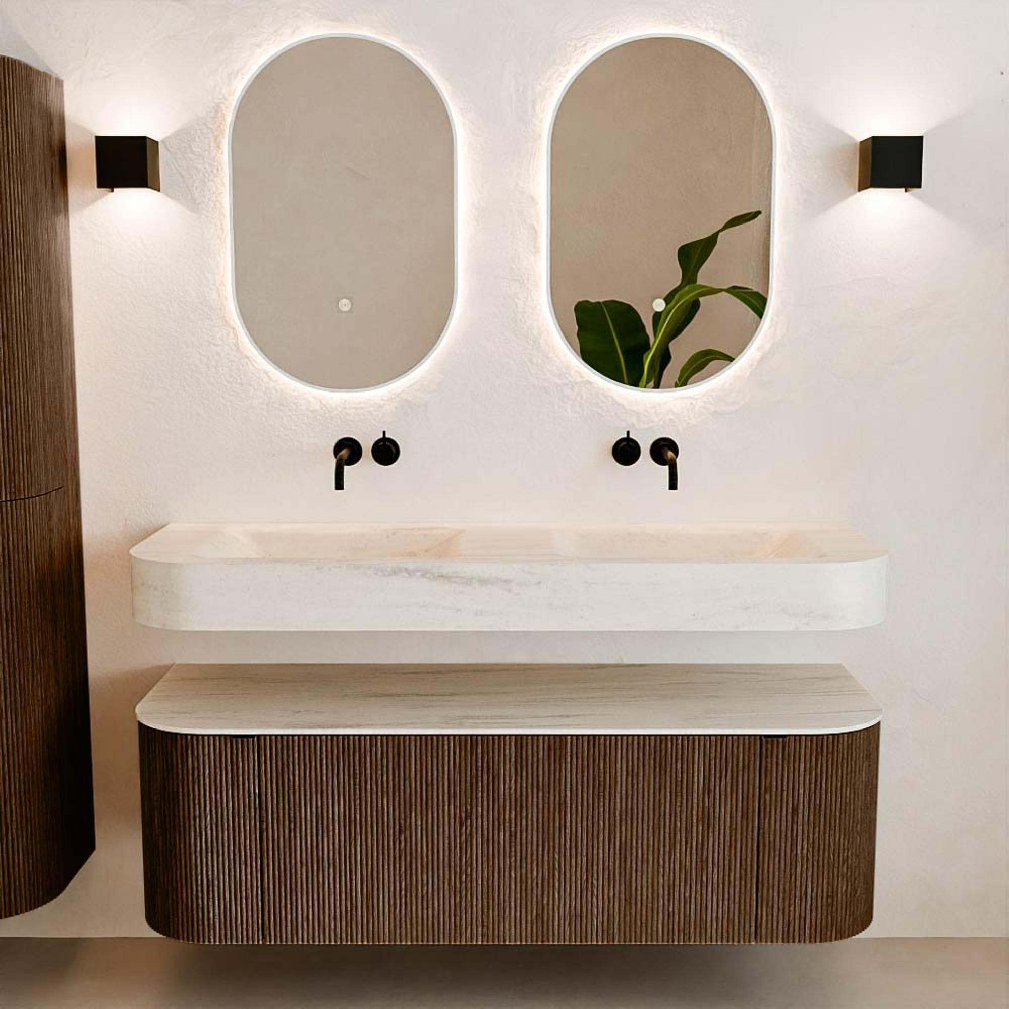 Matériaux naturels dans des tons chauds. Les rainures verticales apportent rythme et texture au design, tandis que le chêne confère une apparence chaleureuse et artisanale. Choisissez parmi 5 teintes de bois OAK, WALNUT, DUSK, SHADOW et RUBY, des couleurs de bois soigneusement sélectionnées pour enrichir les salles de bains modernes et classiques.