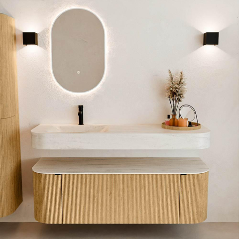 Au-dessus du meuble flotte une vasque suspendue assortie aux coins arrondis – parfaitement adaptée à la forme du meuble. La vasque est réalisée en Solid Surface et suit subtilement les lignes du meuble inférieur, créant ainsi un ensemble harmonieux. Le plan de travail en Solid Surface constitue une base solide et facile d'entretien et complète la combinaison.