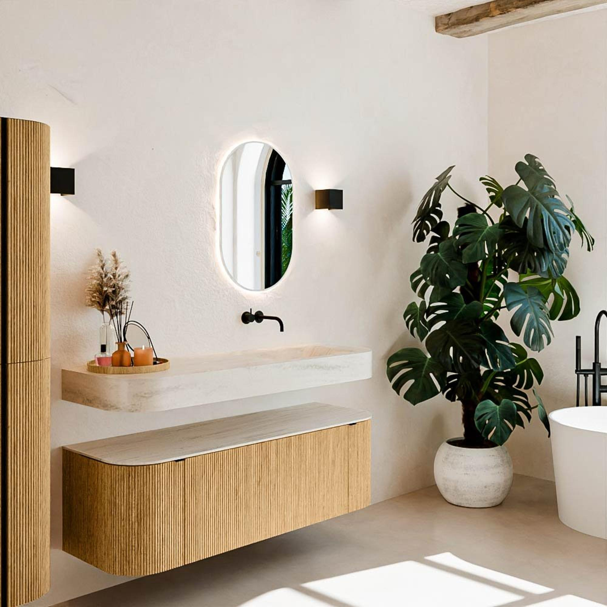 Matériaux naturels dans des tons chauds. Les nervures verticales apportent rythme et texture au design, tandis que le chêne confère une apparence chaleureuse et artisanale. Choisissez parmi 5 teintes de bois OAK, WALNUT, DUSK, SHADOW et RUBY, des couleurs de bois soigneusement sélectionnées pour enrichir les salles de bains modernes et classiques.