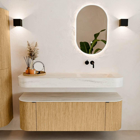 Au-dessus du meuble flotte une vasque suspendue assortie aux coins arrondis – parfaitement adaptée à la forme du meuble. La vasque est réalisée en Solid Surface et suit subtilement les lignes du meuble inférieur, créant ainsi un ensemble harmonieux. Le plan de travail en Solid Surface forme une base solide, facile d'entretien, et complète la combinaison.