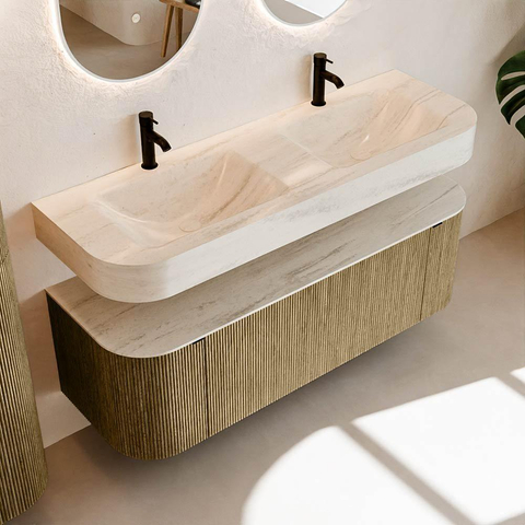 Matériaux naturels dans des tons chauds. Les nervures verticales apportent rythme et texture au design, tandis que le chêne confère une apparence chaleureuse et artisanale. Choisissez parmi 5 teintes de bois OAK, WALNUT, DUSK, SHADOW et RUBY, des couleurs de bois soigneusement sélectionnées pour enrichir les salles de bains modernes et classiques.