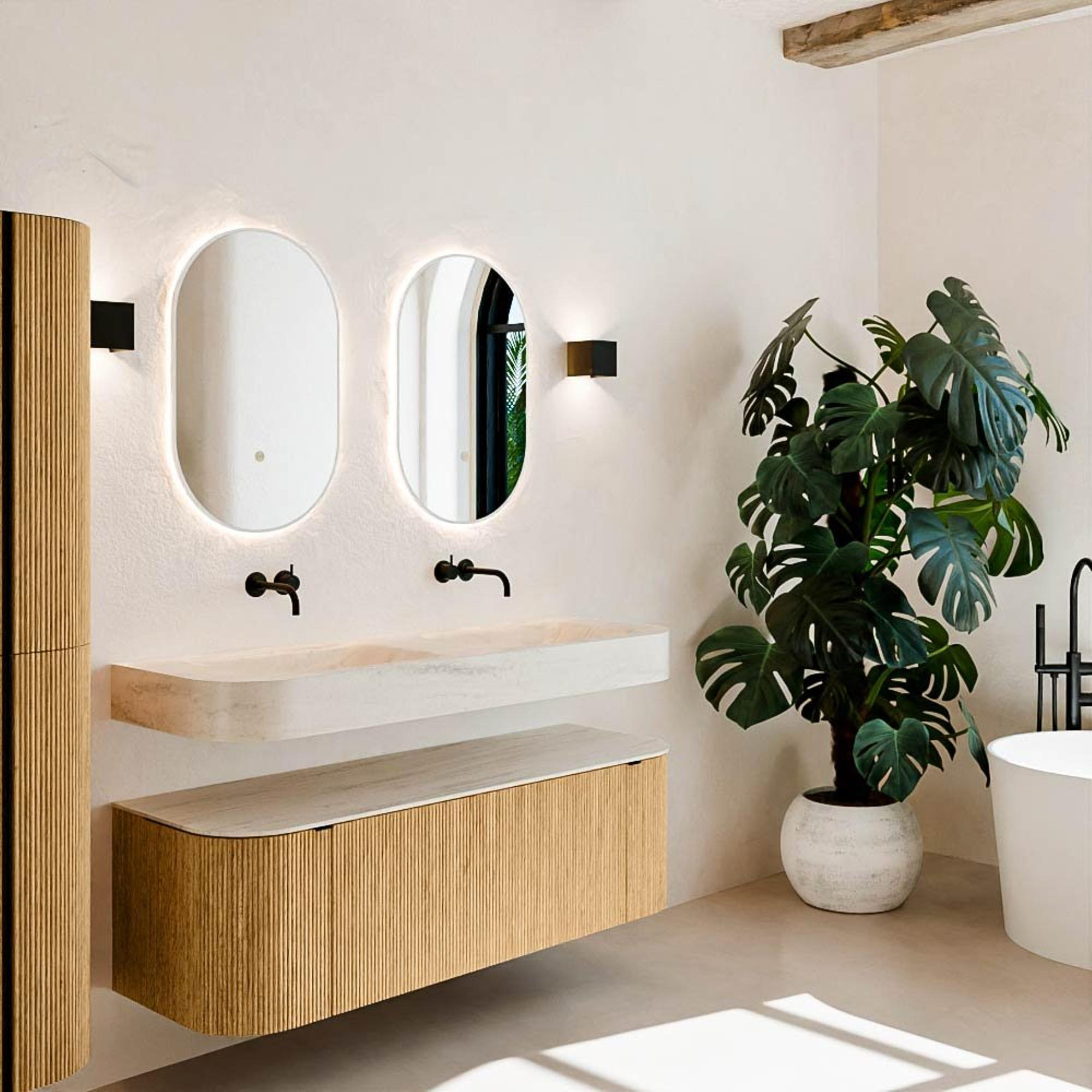 MONDIAZ THOR-DLUX 140cm meuble de salle de bains arrondi gauche + droite couleur Oak avec 1 tiroir et 2 portes. Vasque suspendue CLOUD Double sans trou de robinet couleur Meli.