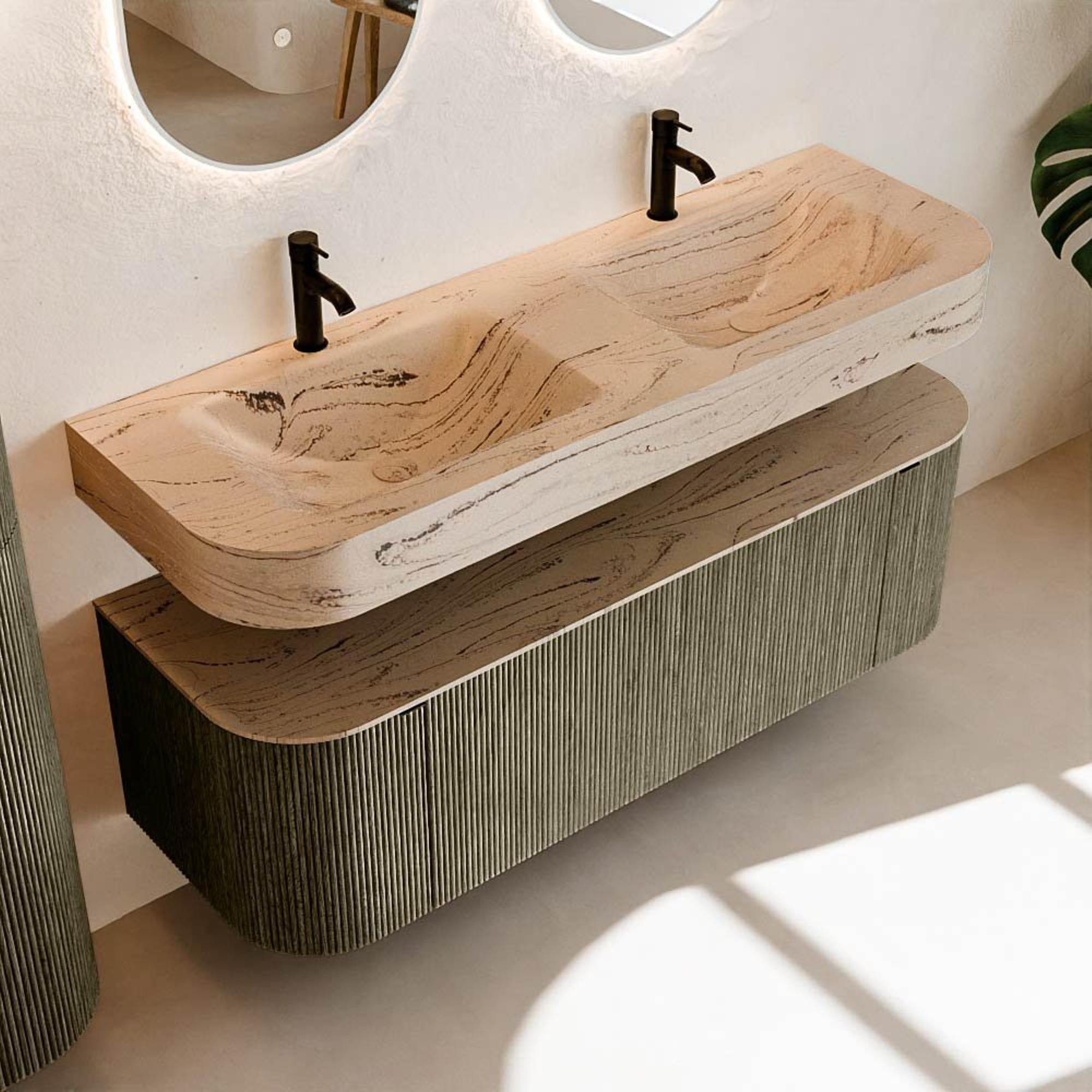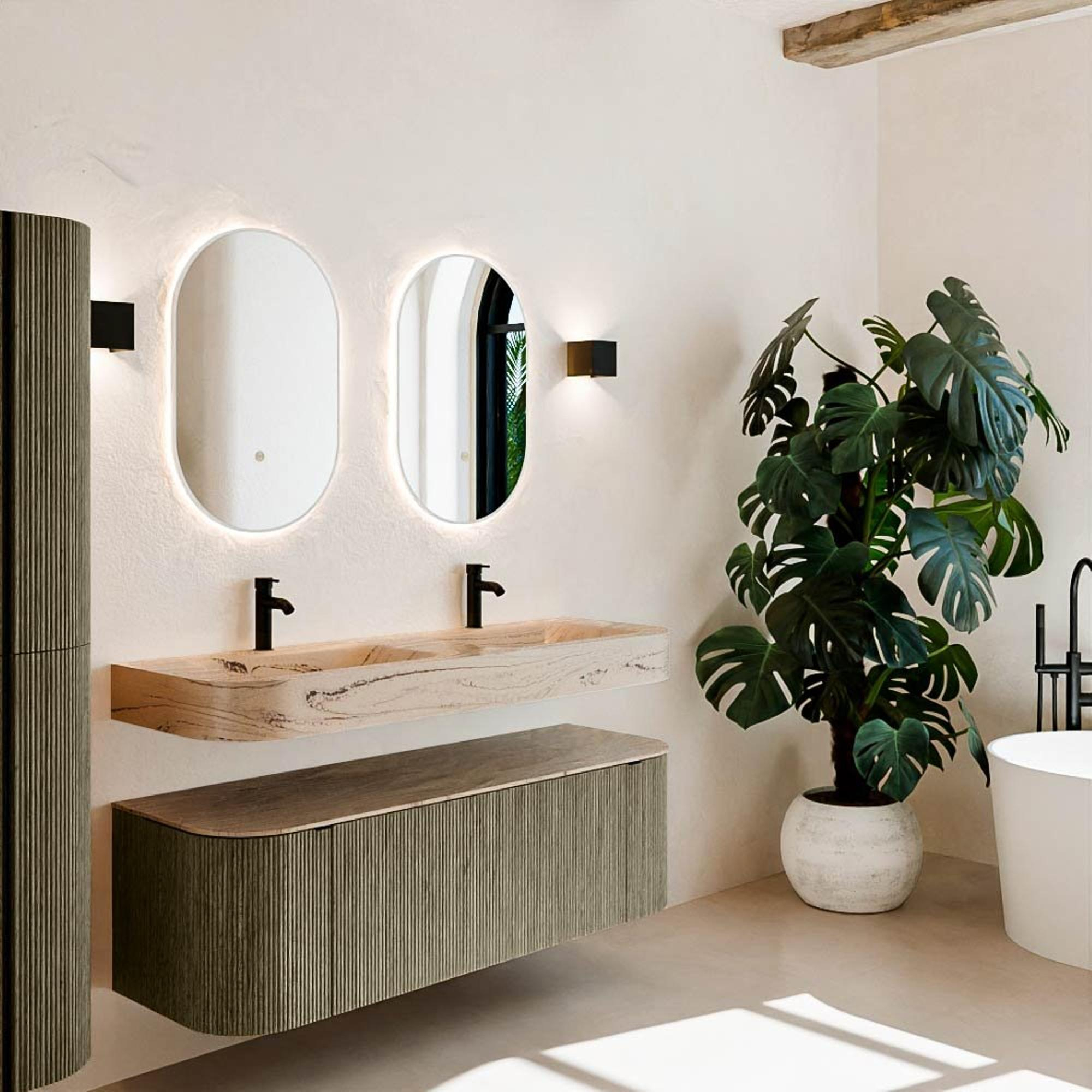 Matériaux naturels dans des tons chauds. Les nervures verticales apportent rythme et texture au design, tandis que le chêne confère une apparence chaleureuse et artisanale. Choisissez parmi 5 teintes de bois OAK, WALNUT, DUSK, SHADOW et RUBY, des couleurs de bois soigneusement sélectionnées pour enrichir les salles de bains modernes et classiques.