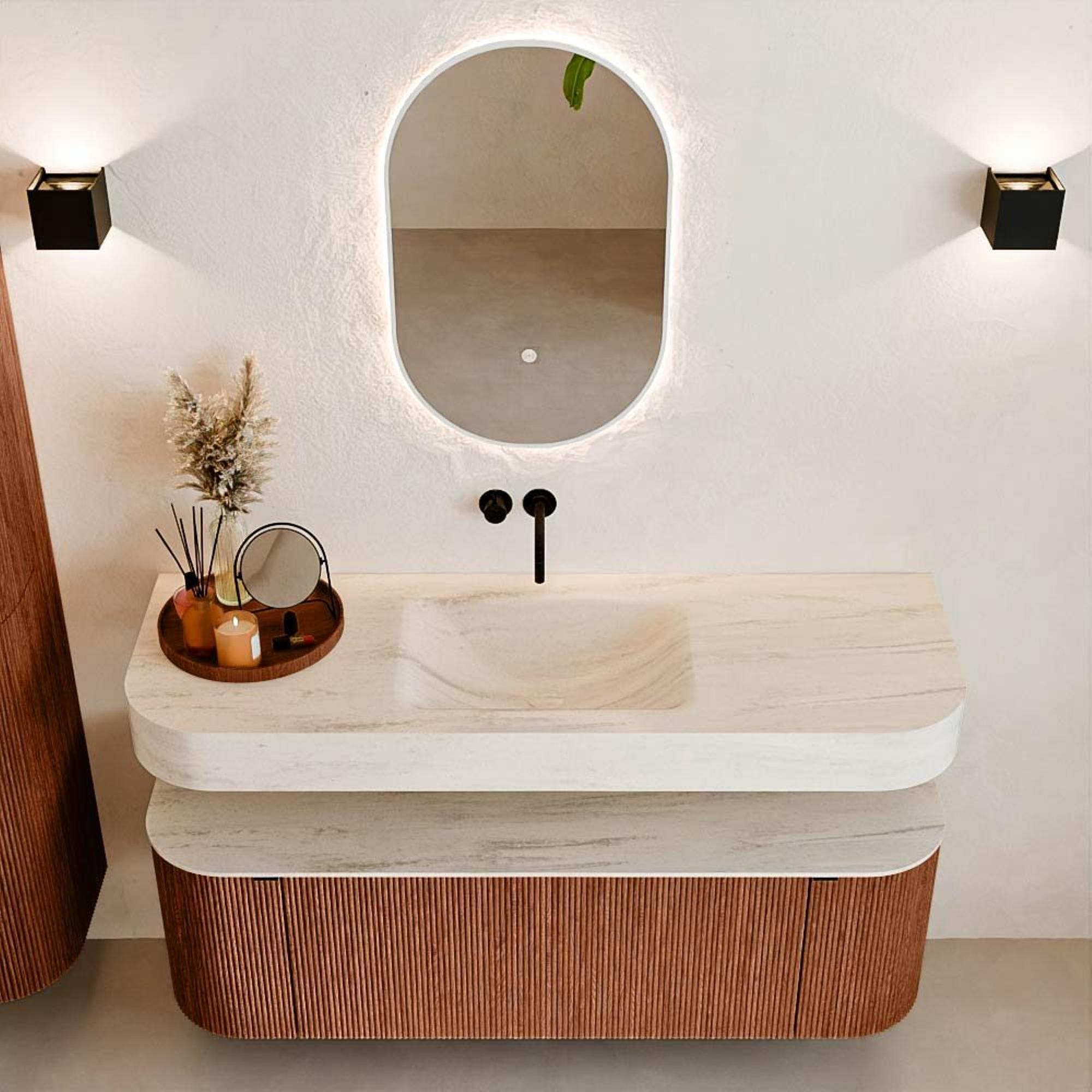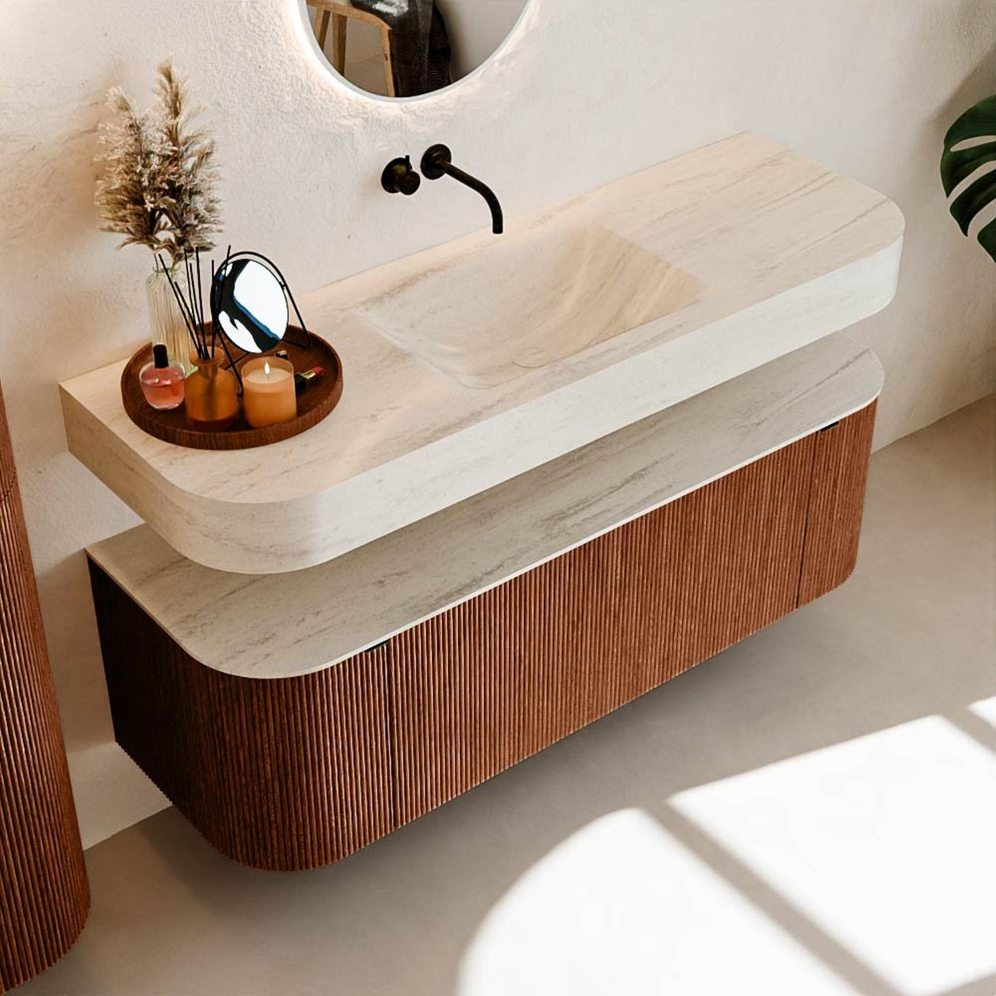 Au-dessus du meuble flotte une vasque suspendue assortie aux coins arrondis – parfaitement adaptée à la forme du meuble. La vasque est réalisée en Solid Surface et suit subtilement les lignes du meuble inférieur, créant ainsi un ensemble harmonieux. Le plan de travail en Solid Surface forme une base solide et facile d'entretien et complète la combinaison.