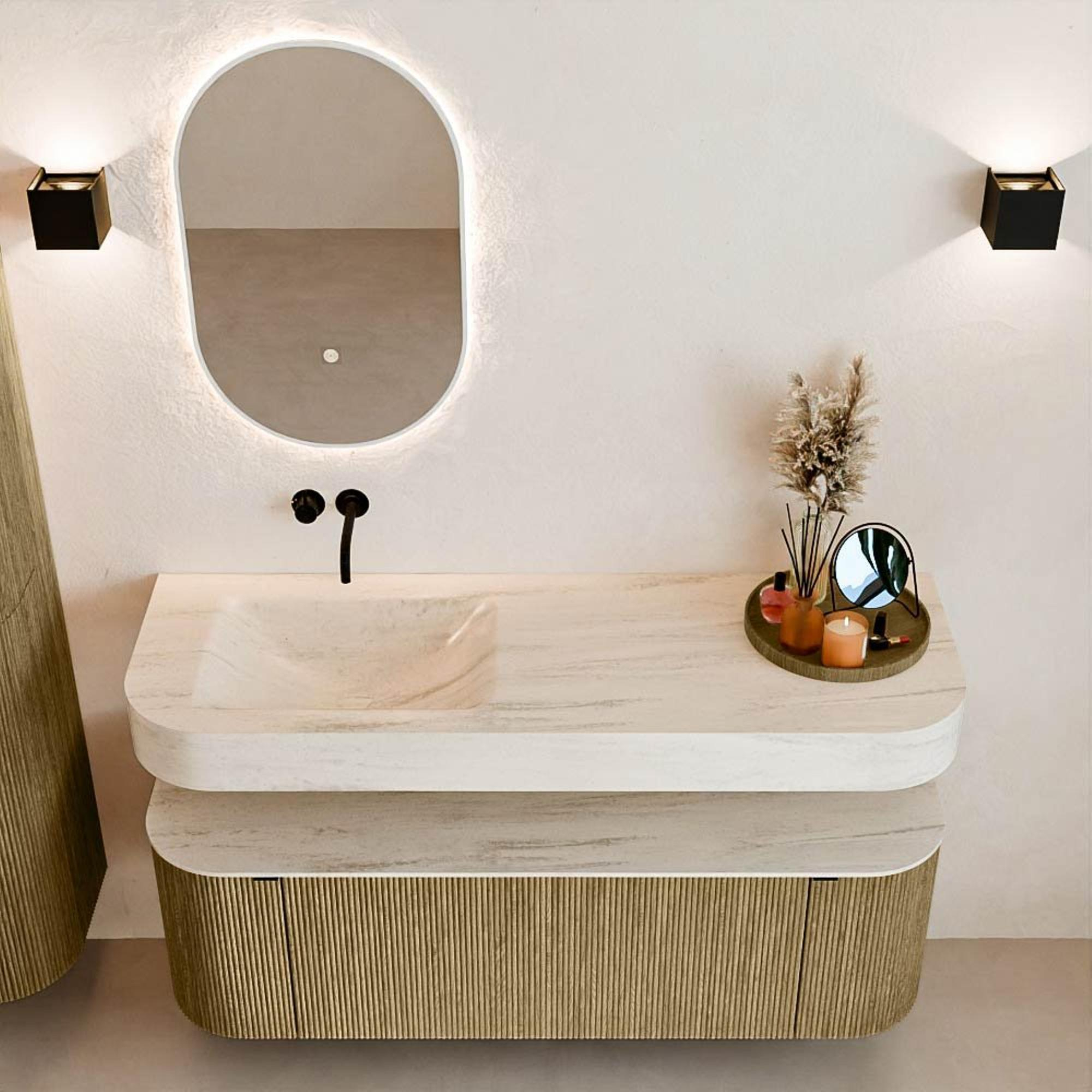 Matériaux naturels dans des tons chauds. Les nervures verticales apportent rythme et texture au design, tandis que le chêne confère une apparence chaleureuse et artisanale. Choisissez parmi 5 teintes de bois OAK, WALNUT, DUSK, SHADOW et RUBY, des couleurs de bois soigneusement sélectionnées pour enrichir les salles de bains modernes et classiques.