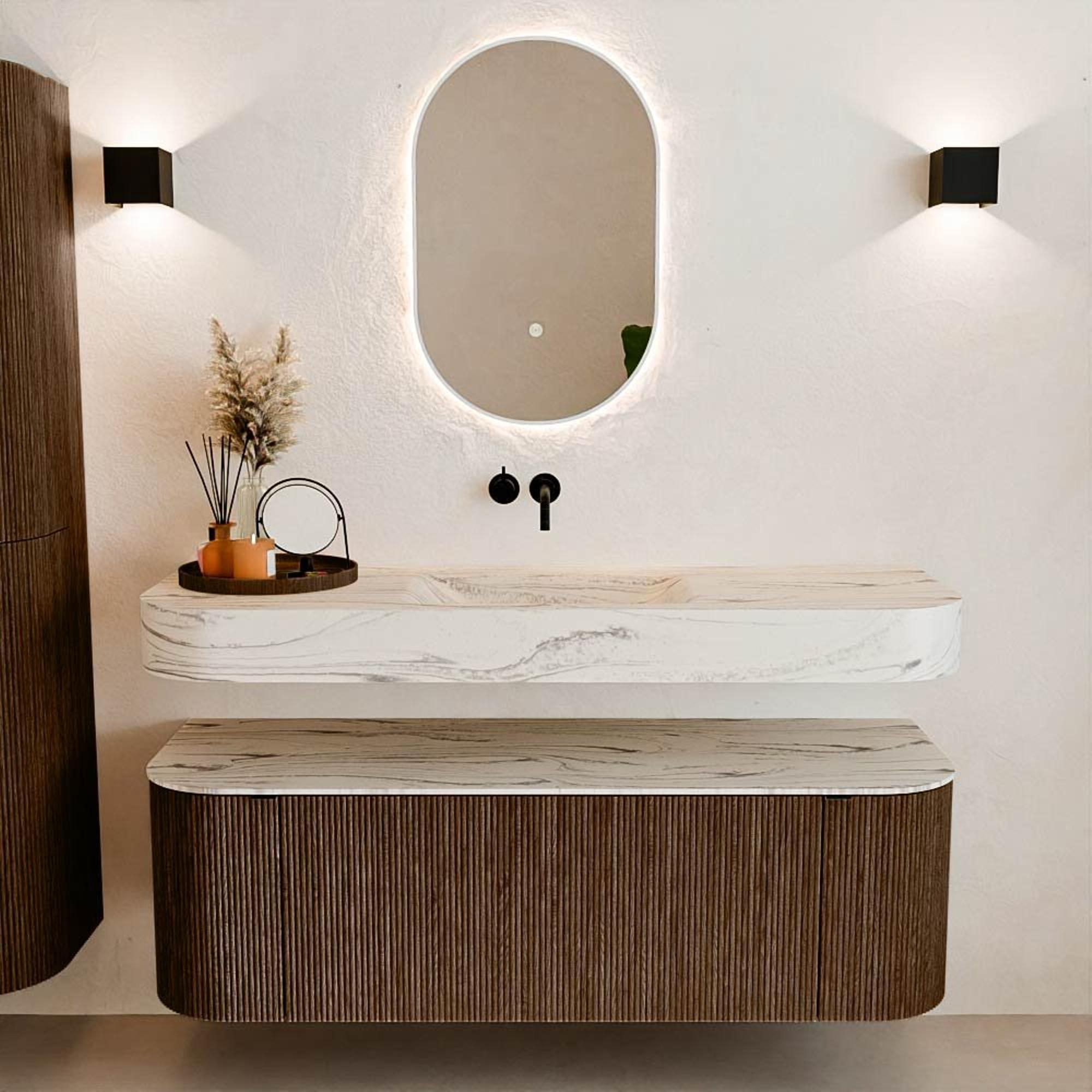Matériaux naturels dans des tons chauds. Les rainures verticales apportent rythme et texture au design, tandis que le chêne confère une apparence chaleureuse et artisanale. Choisissez parmi 5 teintes de bois OAK, WALNUT, DUSK, SHADOW et RUBY, des couleurs de bois soigneusement sélectionnées pour enrichir les salles de bains modernes et classiques.