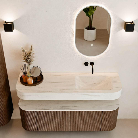 Au-dessus du meuble flotte une vasque suspendue assortie aux coins arrondis – parfaitement adaptée à la forme du meuble. La vasque est réalisée en Solid Surface et suit subtilement les lignes du meuble sous-jacent, créant ainsi un ensemble harmonieux. Le plan de travail en Solid Surface forme une base solide et facile d'entretien et complète la combinaison.