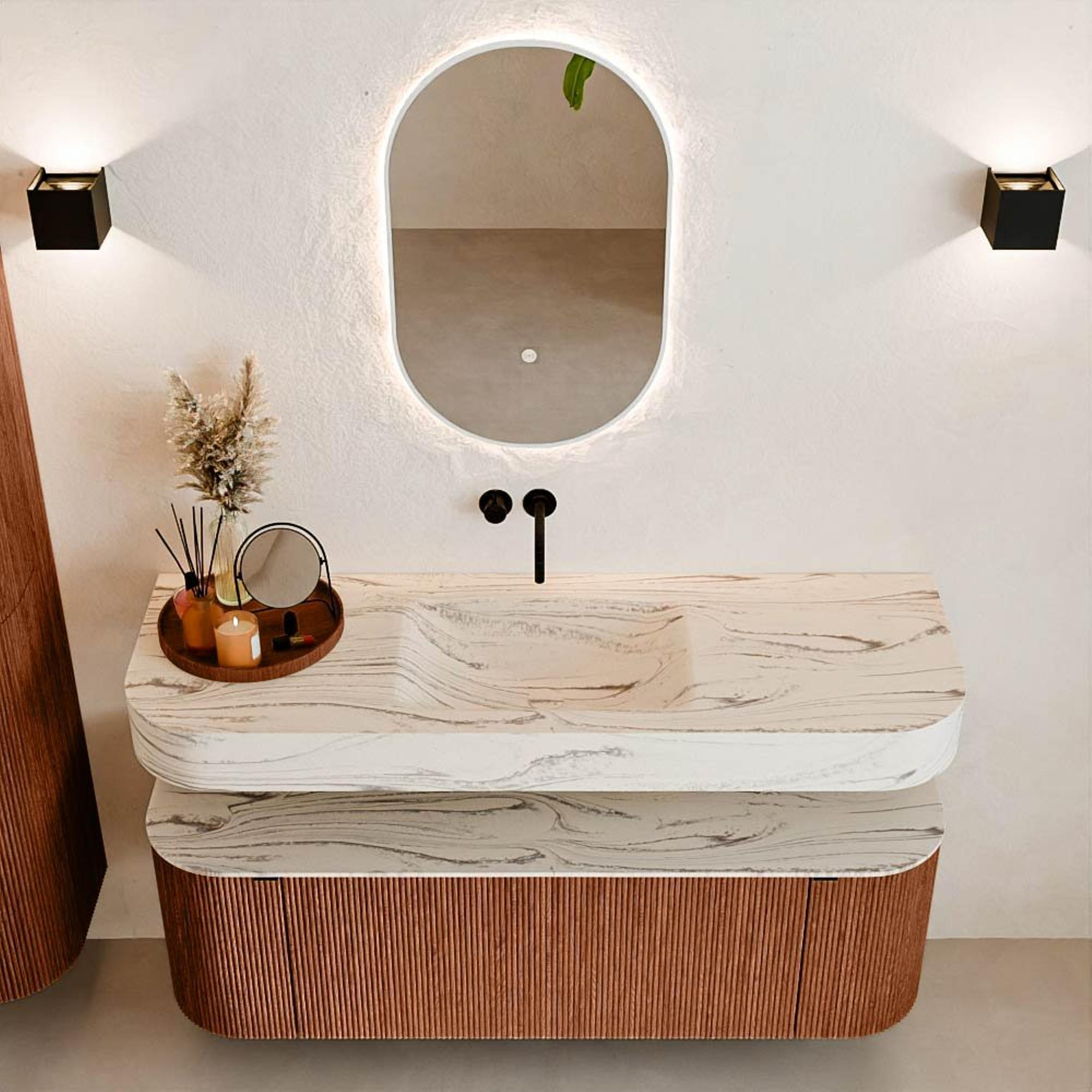 Au-dessus du meuble flotte une vasque suspendue assortie aux coins arrondis – parfaitement adaptée à la forme du meuble. La vasque est réalisée en Solid Surface et suit subtilement les lignes du meuble inférieur, créant ainsi un ensemble harmonieux. Le plan de travail en Solid Surface constitue une base solide et facile d'entretien et complète la combinaison.