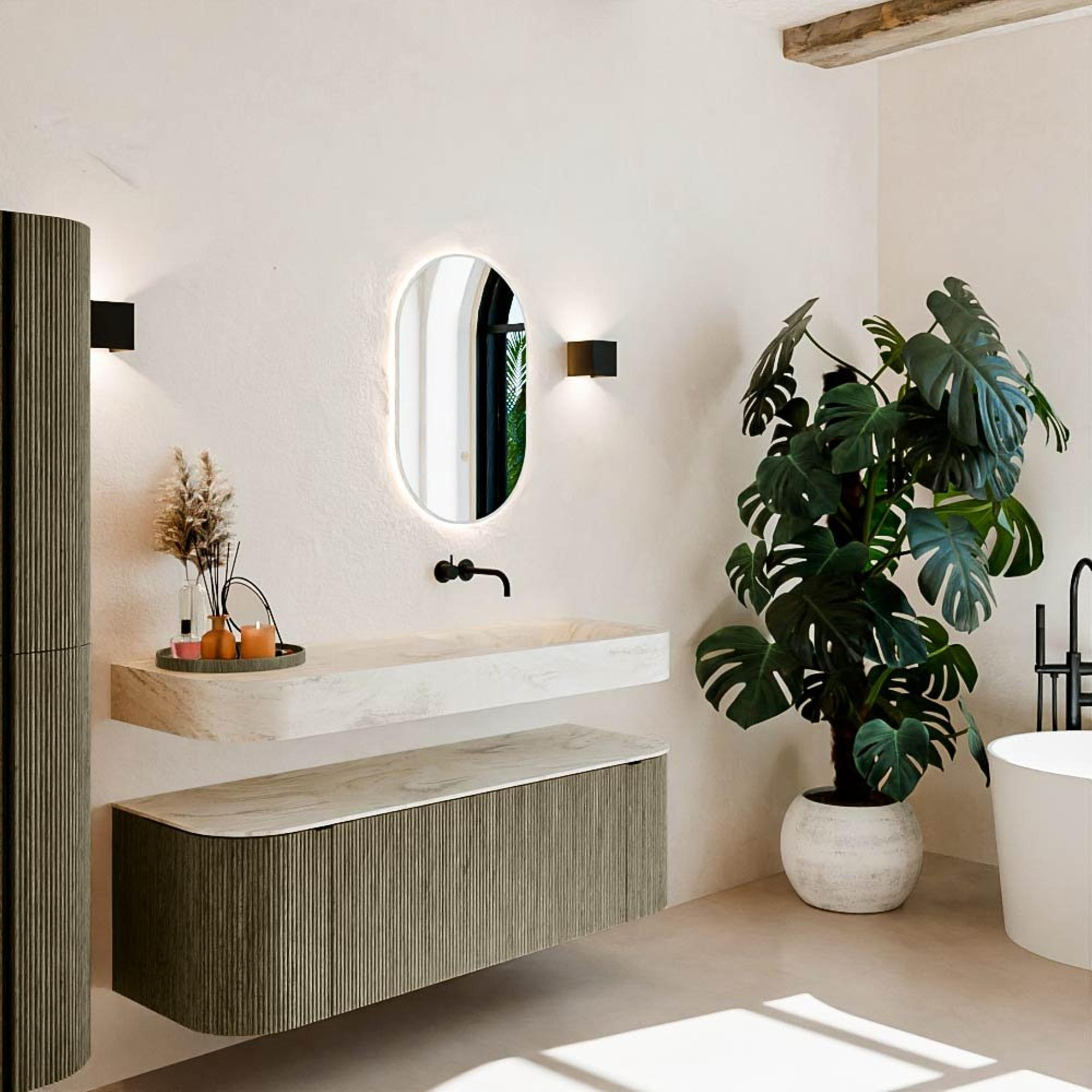Matériaux naturels dans des tons chauds. Les rainures verticales apportent rythme et texture au design, tandis que le chêne confère une apparence chaleureuse et artisanale. Choisissez parmi 5 teintes de bois OAK, WALNUT, DUSK, SHADOW et RUBY, des couleurs de bois soigneusement sélectionnées pour enrichir les salles de bains modernes et classiques.