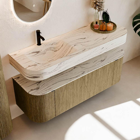 Matériaux naturels dans des tons chauds. Les nervures verticales apportent rythme et texture au design, tandis que le chêne confère une apparence chaleureuse et artisanale. Choisissez parmi 5 teintes de bois OAK, WALNUT, DUSK, SHADOW et RUBY, des couleurs de bois soigneusement sélectionnées pour enrichir les salles de bains modernes et classiques.