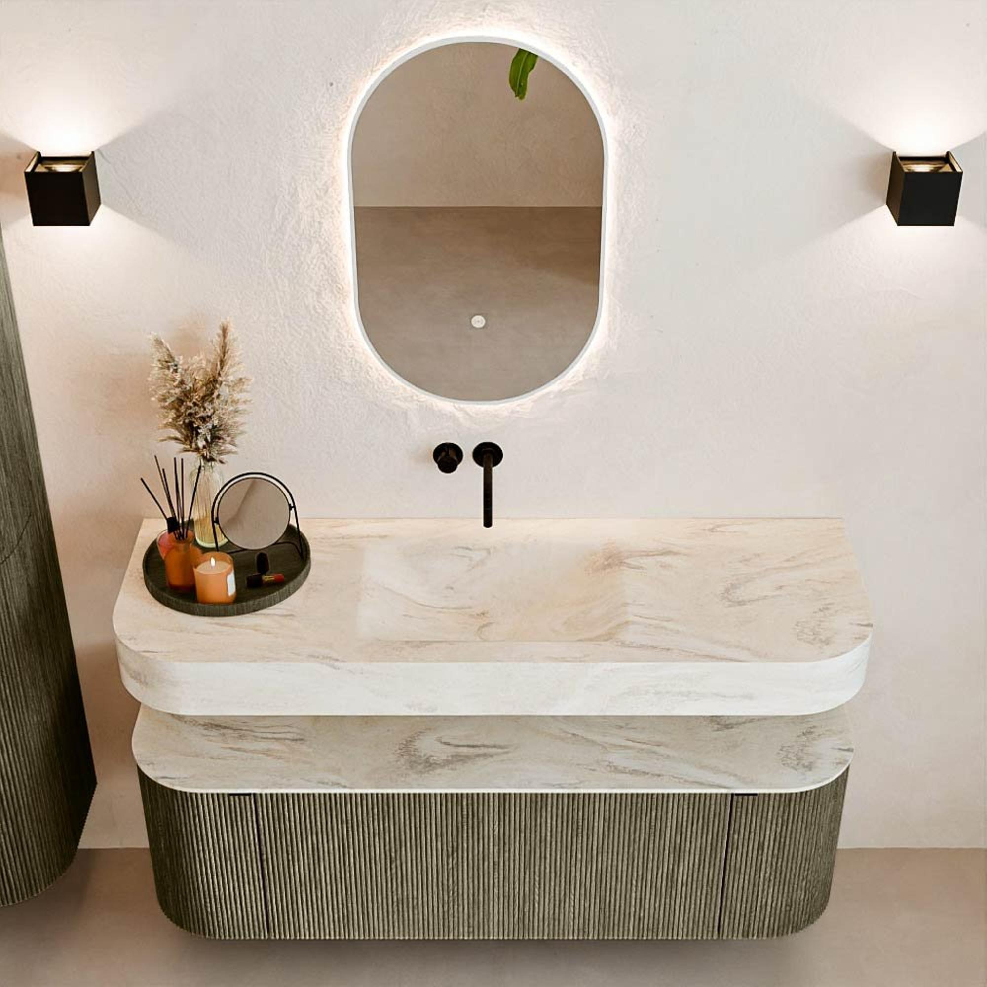 Au-dessus du meuble flotte une vasque suspendue assortie aux coins arrondis – parfaitement adaptée à la forme du meuble. La vasque est réalisée en Solid Surface et suit subtilement les lignes du meuble inférieur, créant ainsi un ensemble harmonieux. Le plan de travail en Solid Surface forme une base solide et facile d'entretien et complète la combinaison.