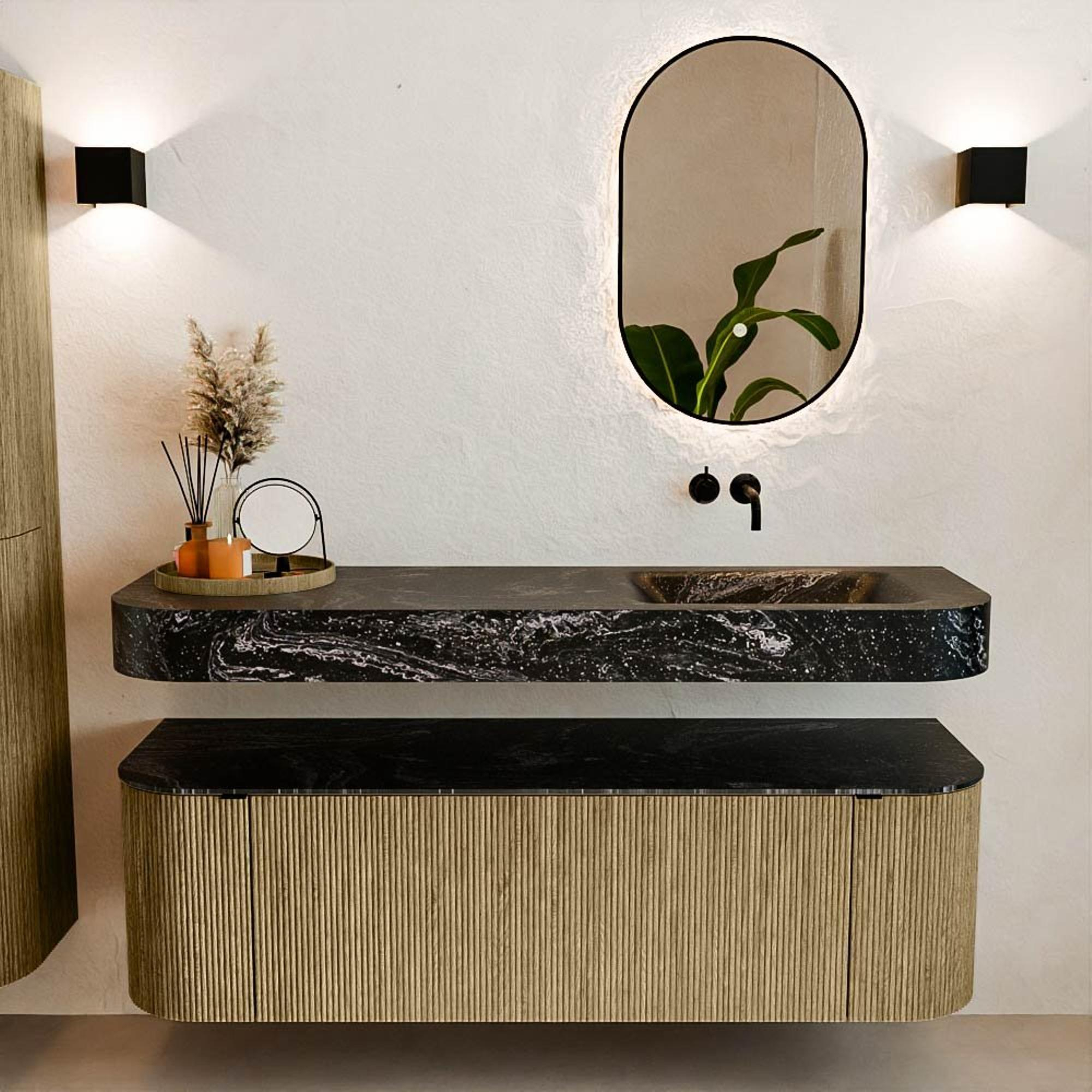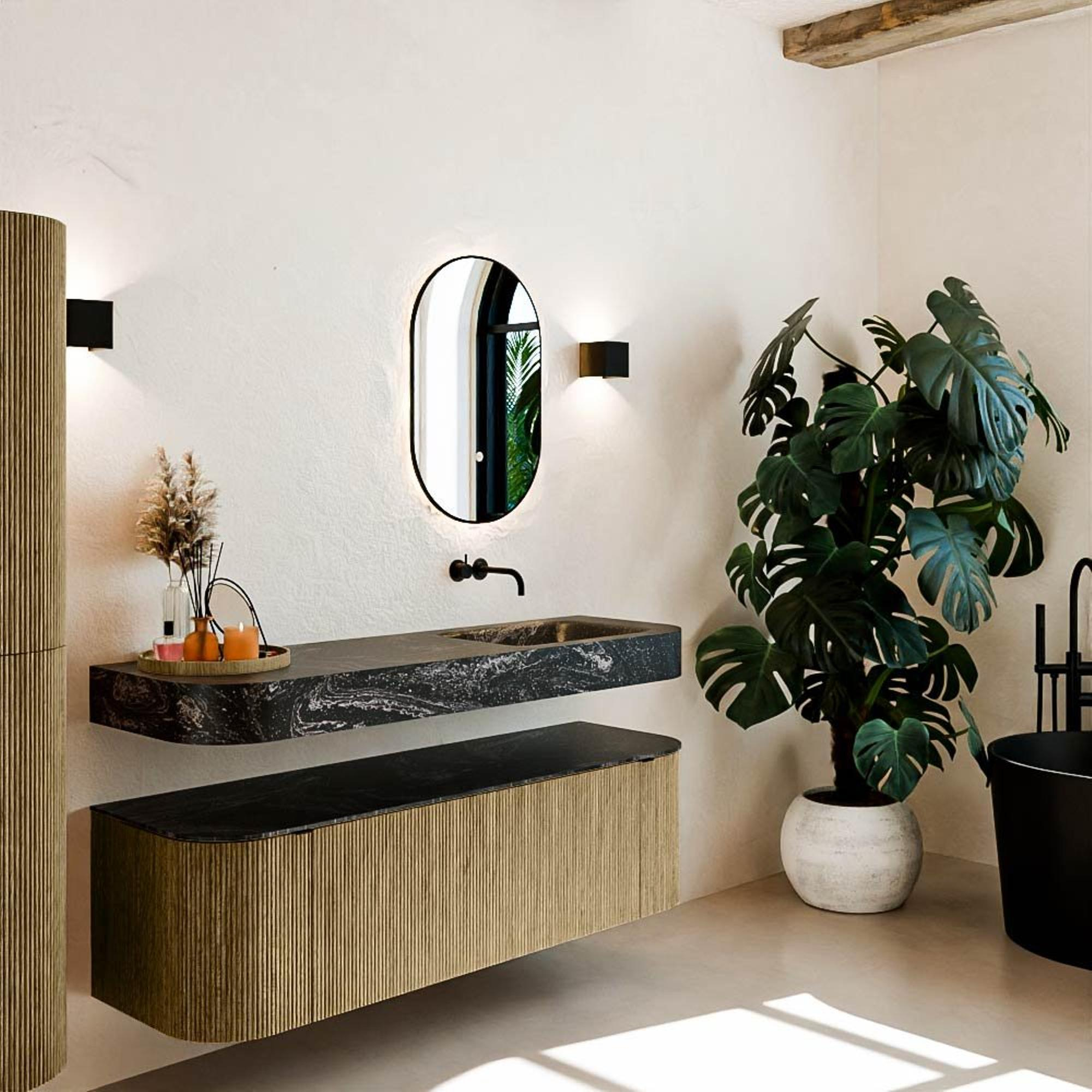 Matériaux naturels dans des tons chauds. Les nervures verticales apportent rythme et texture au design, tandis que le chêne confère une apparence chaleureuse et artisanale. Choisissez parmi 5 teintes de bois OAK, WALNUT, DUSK, SHADOW et RUBY, des couleurs de bois soigneusement sélectionnées pour enrichir les salles de bains modernes et classiques.