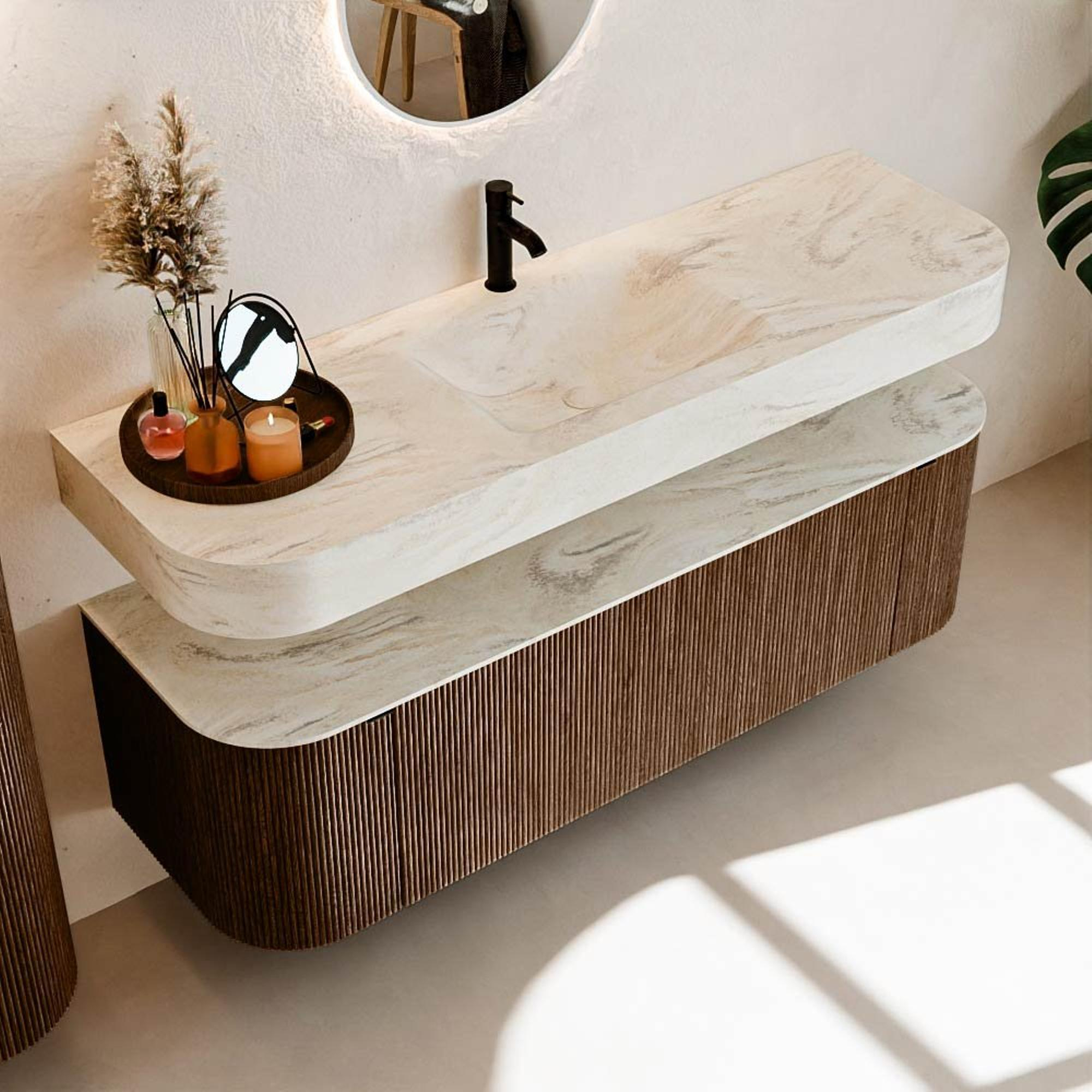 MONDIAZ THOR-DLUX 150cm meuble de salle de bains arrondi gauche + droite couleur Walnut avec 1 tiroir et 2 portes. Vasque suspendue CLOUD Milieu 1 trou de robinet couleur Ostra.