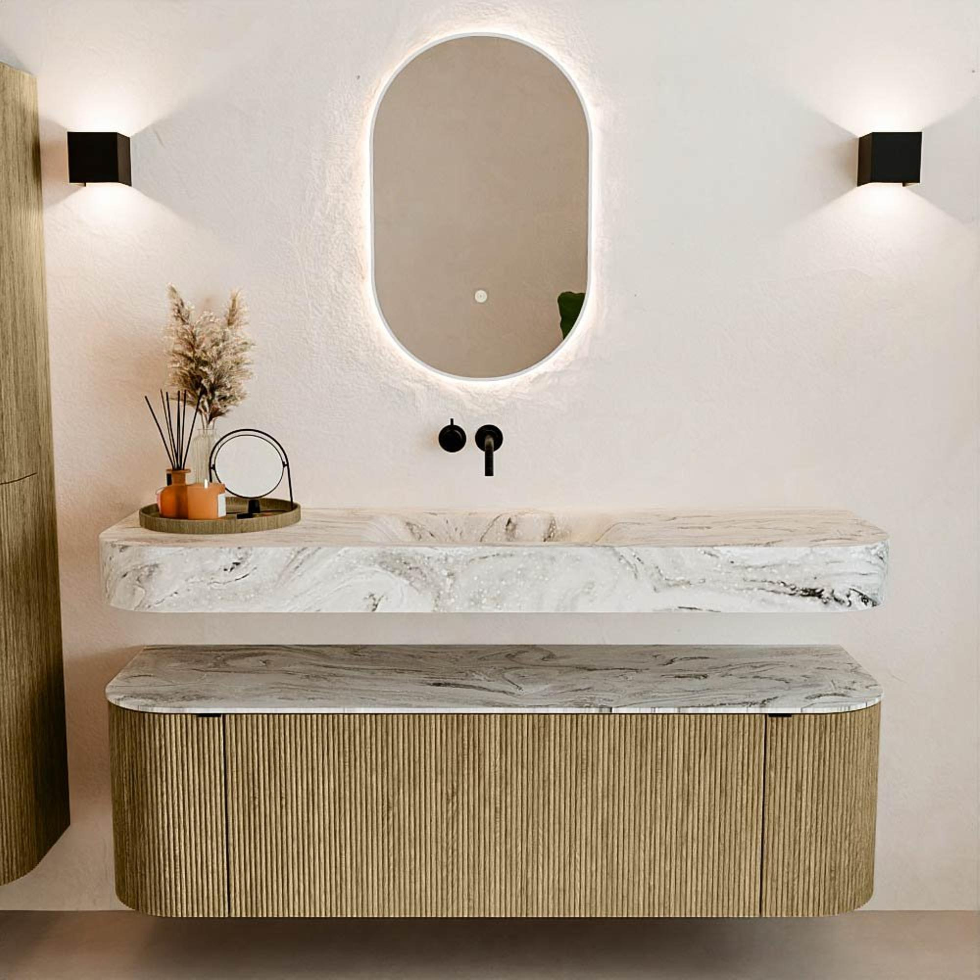 Au-dessus du meuble flotte une vasque suspendue assortie aux coins arrondis – parfaitement adaptée à la forme du meuble. La vasque est réalisée en Solid Surface et suit subtilement les lignes du meuble inférieur, créant ainsi un ensemble harmonieux. Le plan de travail en Solid Surface forme une base solide et facile d'entretien et complète la combinaison.