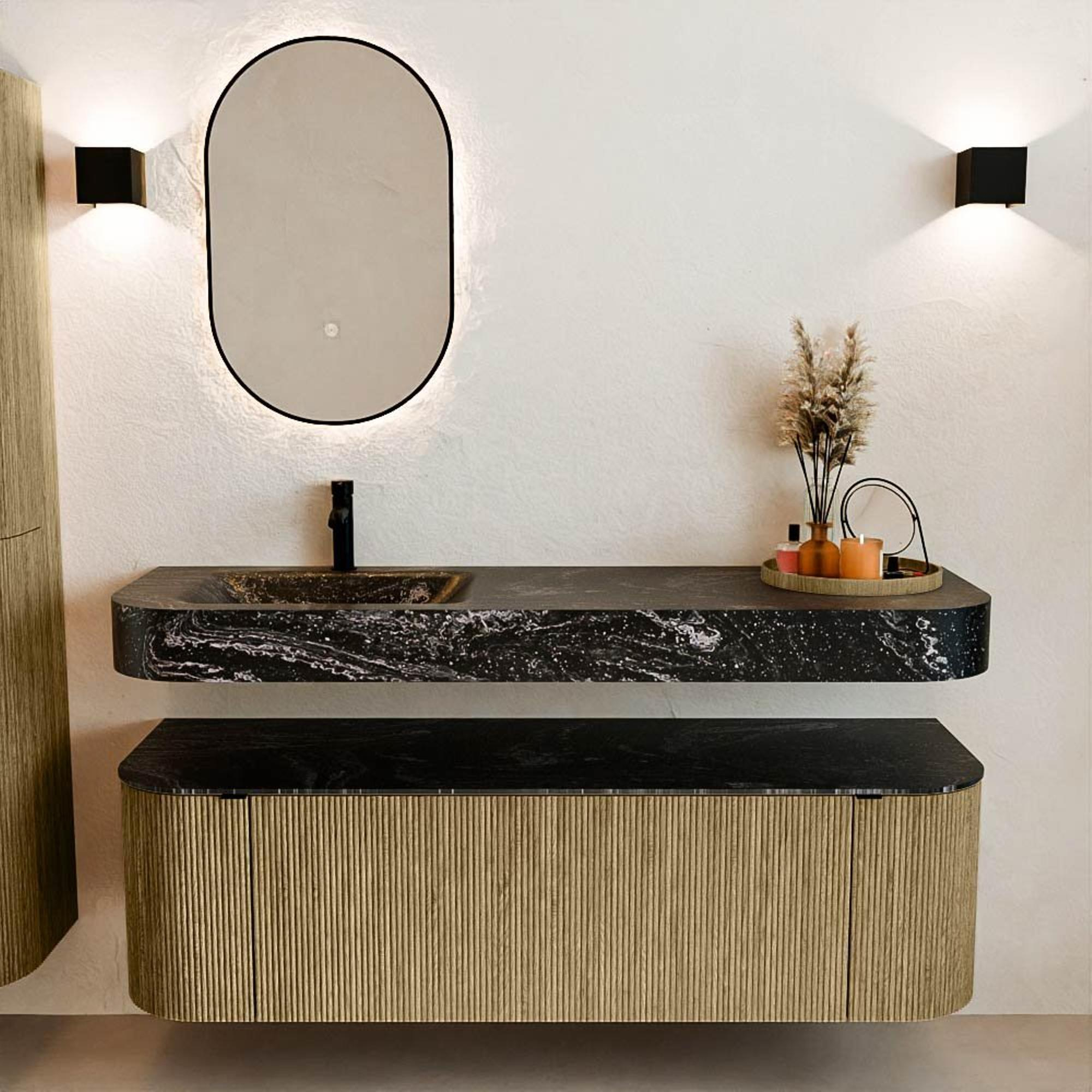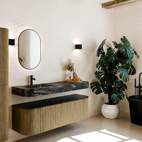 Matériaux naturels dans des tons chauds. Les cannelures verticales apportent rythme et texture au design, tandis que le chêne confère une apparence chaleureuse et artisanale. Choisissez parmi 5 teintes de bois OAK, WALNUT, DUSK, SHADOW et RUBY, des couleurs de bois soigneusement sélectionnées pour enrichir les salles de bains modernes et classiques.