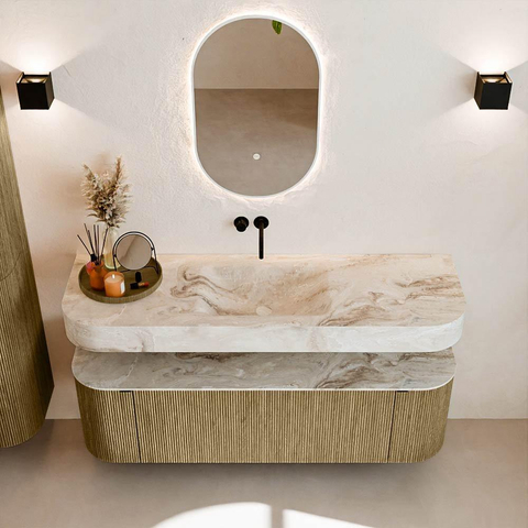 Matériaux naturels dans des tons chauds. Les nervures verticales apportent rythme et texture au design, tandis que le chêne confère une apparence chaleureuse et artisanale. Choisissez parmi 5 teintes de bois OAK, WALNUT, DUSK, SHADOW et RUBY, des couleurs de bois soigneusement sélectionnées pour enrichir les salles de bains modernes et classiques.