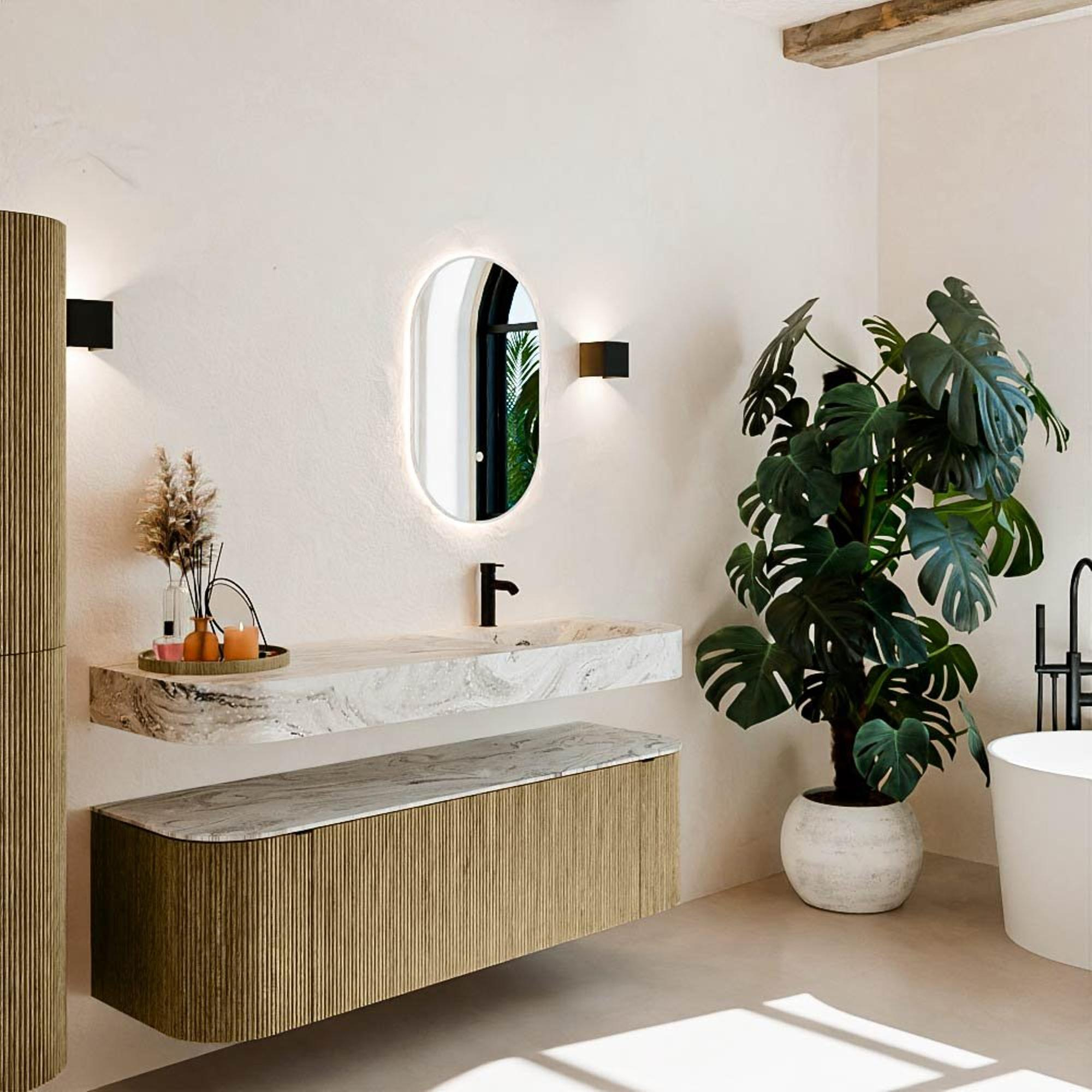 Matériaux naturels dans des tons chauds. Les reliefs verticaux apportent rythme et texture au design, tandis que le chêne confère une apparence chaleureuse et artisanale. Choisissez parmi 5 teintes de bois OAK, WALNUT, DUSK, SHADOW et RUBY, des couleurs de bois soigneusement sélectionnées pour enrichir les salles de bains modernes et classiques.