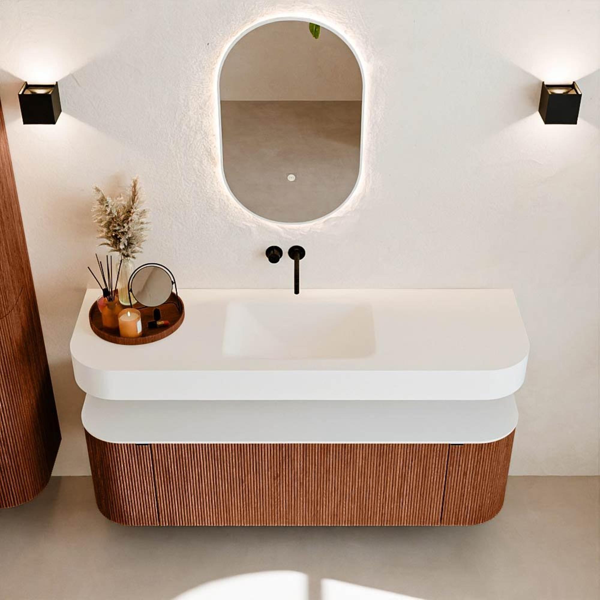 Au-dessus du meuble flotte une vasque suspendue assortie aux coins arrondis – parfaitement adaptée à la forme du meuble. La vasque est réalisée en Solid Surface et suit subtilement les lignes du meuble inférieur, créant un ensemble harmonieux. Le plan de travail en Solid Surface constitue une base solide et facile d'entretien et complète la combinaison.