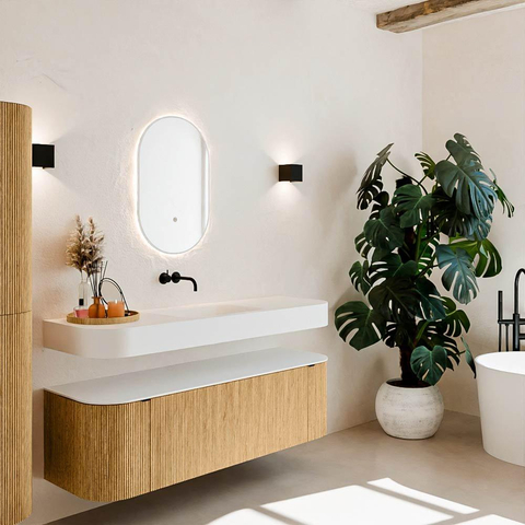 Au-dessus du meuble flotte une vasque suspendue assortie aux coins arrondis – parfaitement adaptée à la forme du meuble. La vasque est en Solid Surface et suit subtilement les lignes du meuble inférieur, créant ainsi un ensemble harmonieux. Le plan de travail en Solid Surface forme une base solide et facile d'entretien, complétant la combinaison.