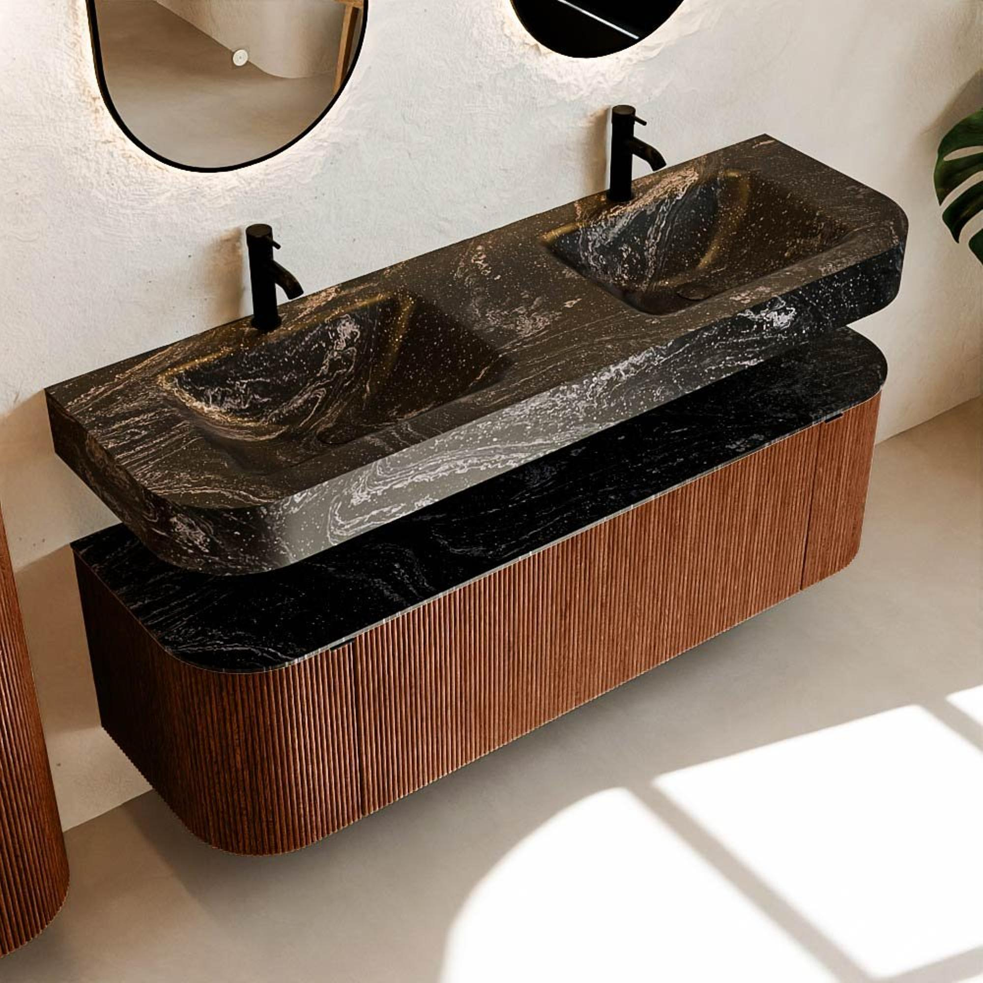 Matériaux naturels dans des tons chauds. Les nervures verticales apportent rythme et texture au design, tandis que le chêne confère une apparence chaleureuse et artisanale. Choisissez parmi 5 teintes de bois OAK, WALNUT, DUSK, SHADOW et RUBY, des couleurs de bois soigneusement sélectionnées pour enrichir les salles de bains modernes et classiques.