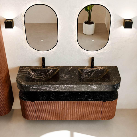 MONDIAZ THOR-DLUX 150cm meuble de salle de bains arrondi gauche + droite couleur Ruby avec 1 tiroir et 2 portes. Vasque suspendue CLOUD Double 2 trous de robinet couleur Lava.