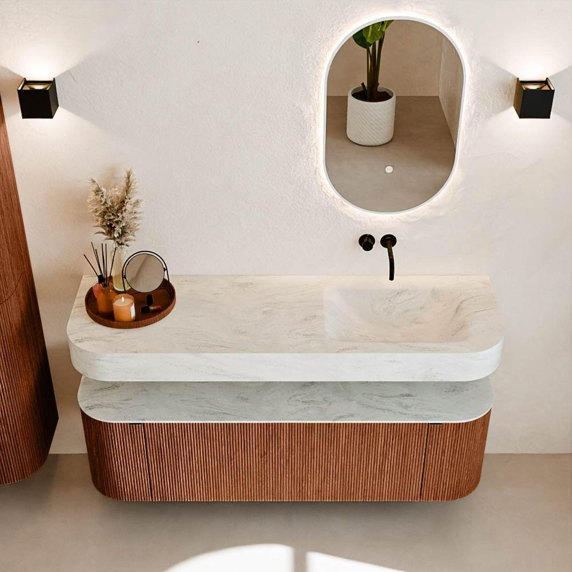Au-dessus du meuble flotte une vasque suspendue assortie aux coins arrondis – parfaitement adaptée à la forme du meuble. La vasque est réalisée en Solid Surface et suit subtilement les lignes du meuble inférieur, créant ainsi un ensemble harmonieux. Le plan de travail en Solid Surface forme une base solide, facile d'entretien, et complète la combinaison.