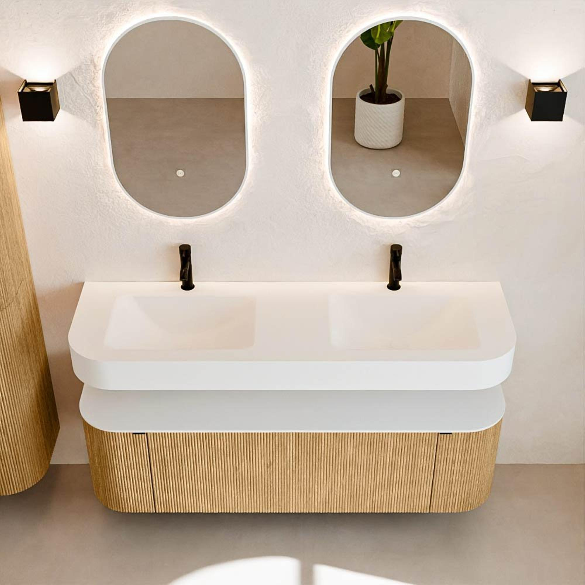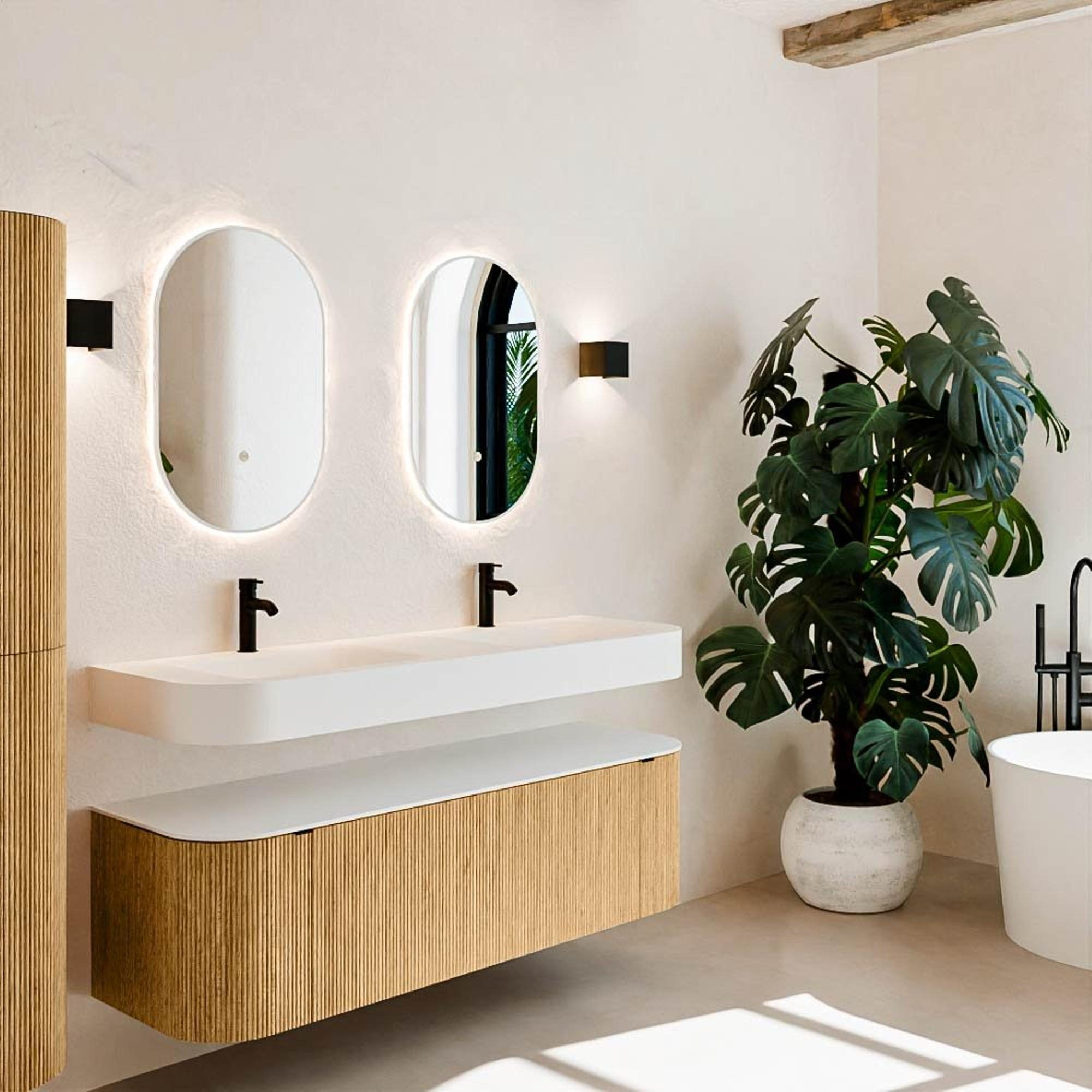 Matériaux naturels dans des tons chauds. Les rainures verticales apportent rythme et texture au design, tandis que le chêne confère une apparence chaleureuse et artisanale. Choisissez parmi 5 teintes de bois OAK, WALNUT, DUSK, SHADOW et RUBY, des couleurs de bois soigneusement sélectionnées pour enrichir les salles de bains modernes et classiques.