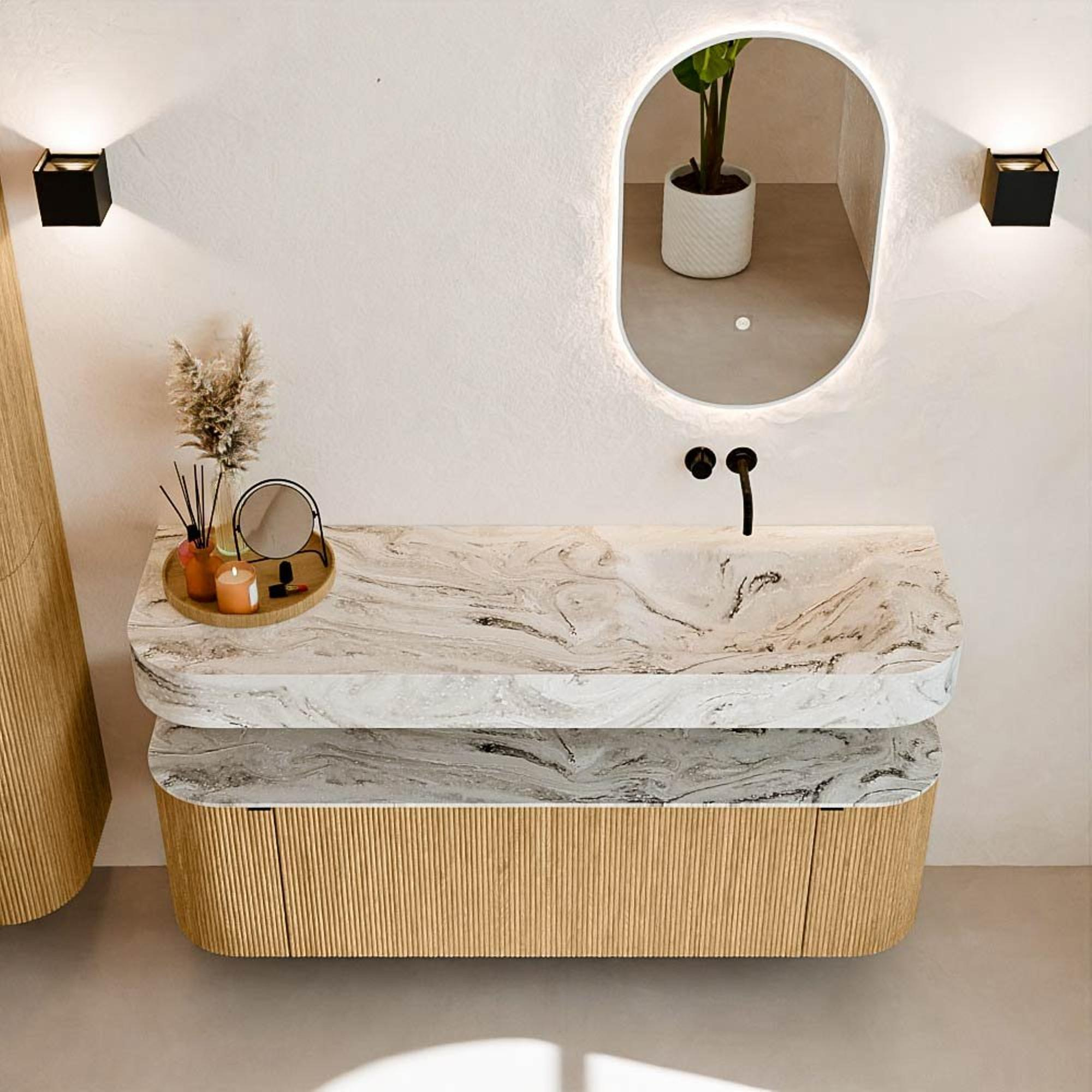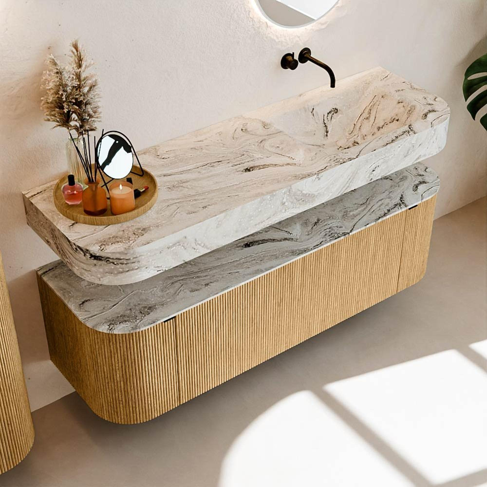 Matériaux naturels dans des tons chauds. Les nervures verticales apportent rythme et texture au design, tandis que le chêne confère une apparence chaleureuse et artisanale. Choisissez parmi 5 teintes de bois OAK, WALNUT, DUSK, SHADOW et RUBY, des couleurs de bois soigneusement sélectionnées pour enrichir les salles de bains modernes et classiques.