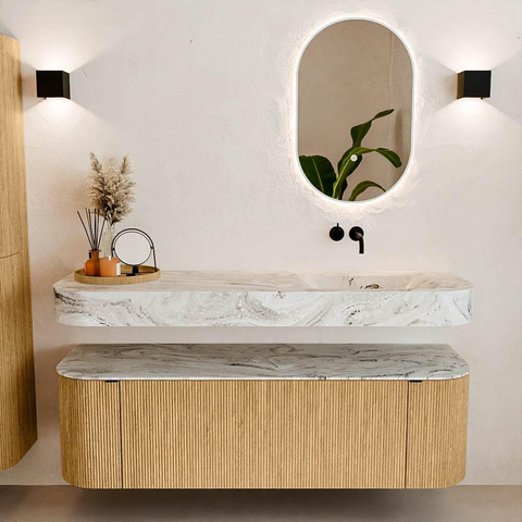 MONDIAZ THOR-DLUX 150cm meuble de salle de bains arrondi gauche + droite couleur Oak avec 1 tiroir et 2 portes. Vasque suspendue CLOUD droite sans trou de robinet couleur Glace.