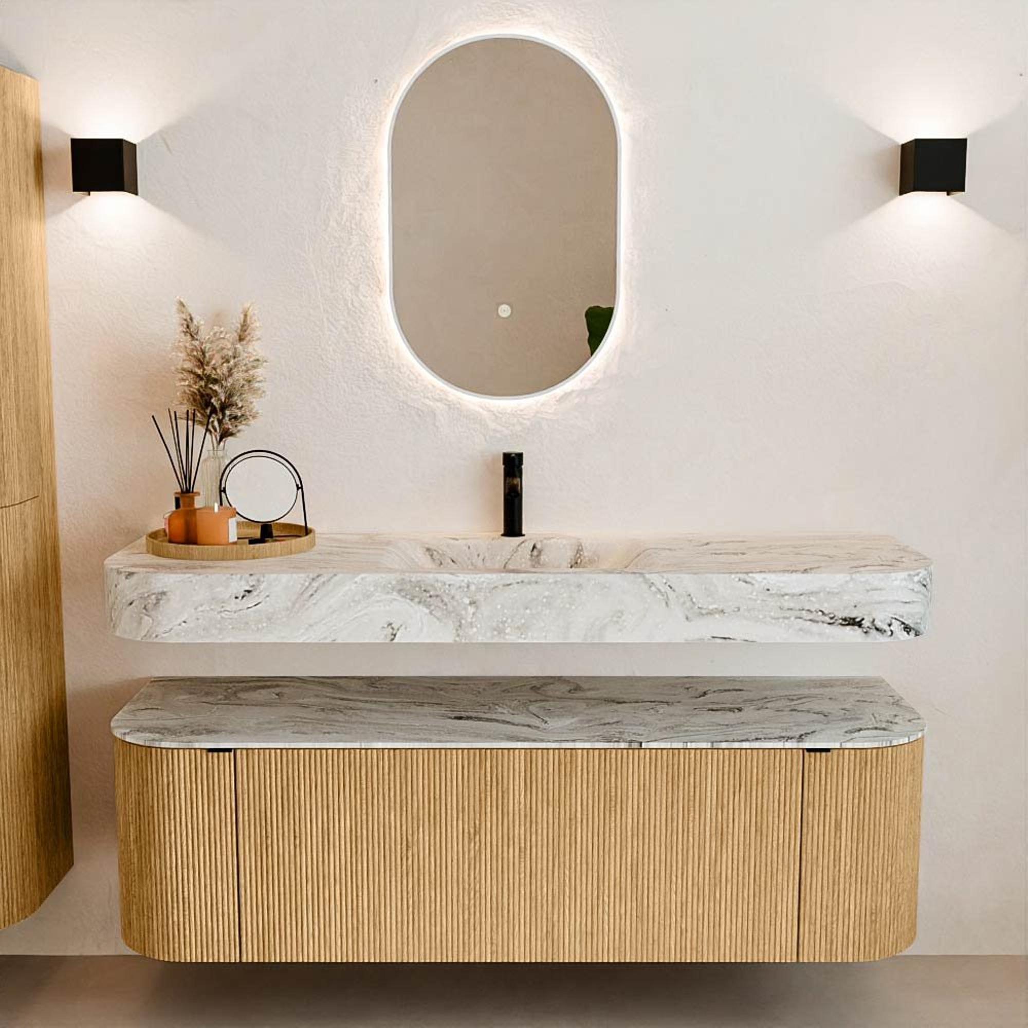 MONDIAZ THOR-DLUX 150cm meuble de salle de bains arrondi gauche + droite couleur Oak avec 1 tiroir et 2 portes. Vasque suspendue CLOUD Milieu 1 trou de robinet couleur Glace.