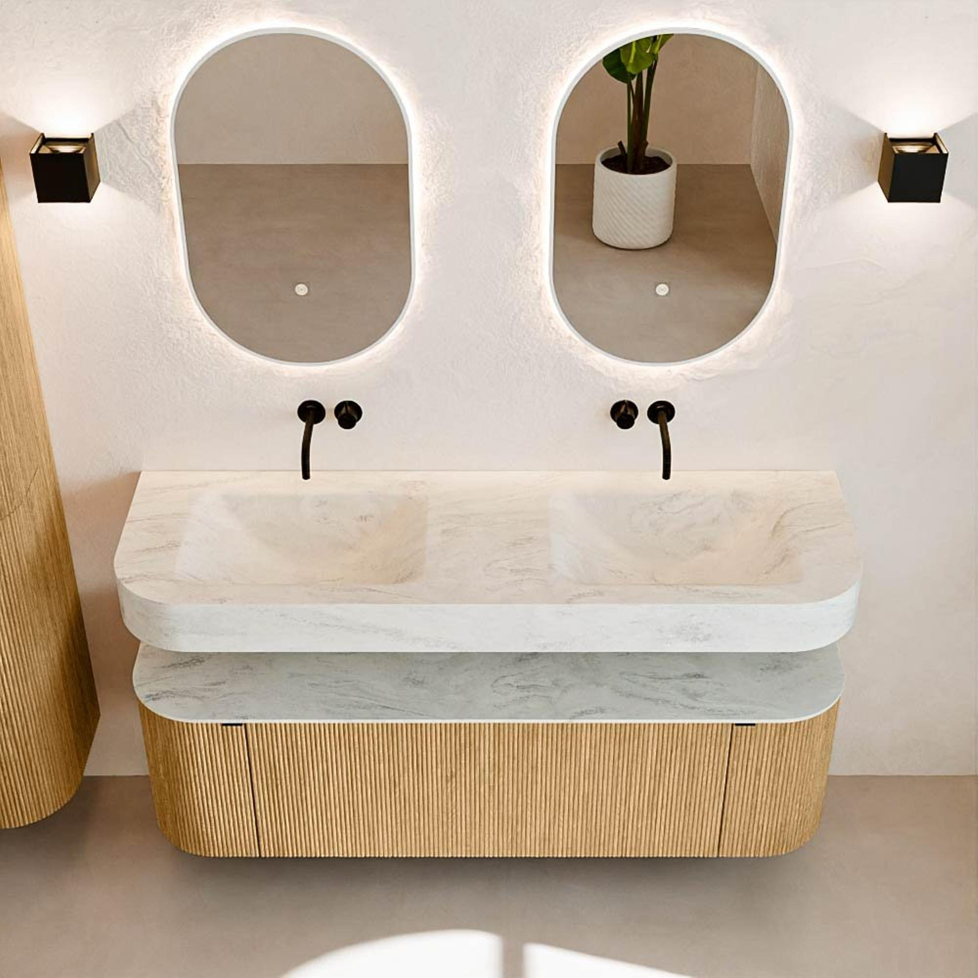 MONDIAZ THOR-DLUX 150cm meuble de salle de bains arrondi gauche + droite couleur Oak avec 1 tiroir et 2 portes. Vasque suspendue CLOUD Double sans trou de robinet couleur Opalo.