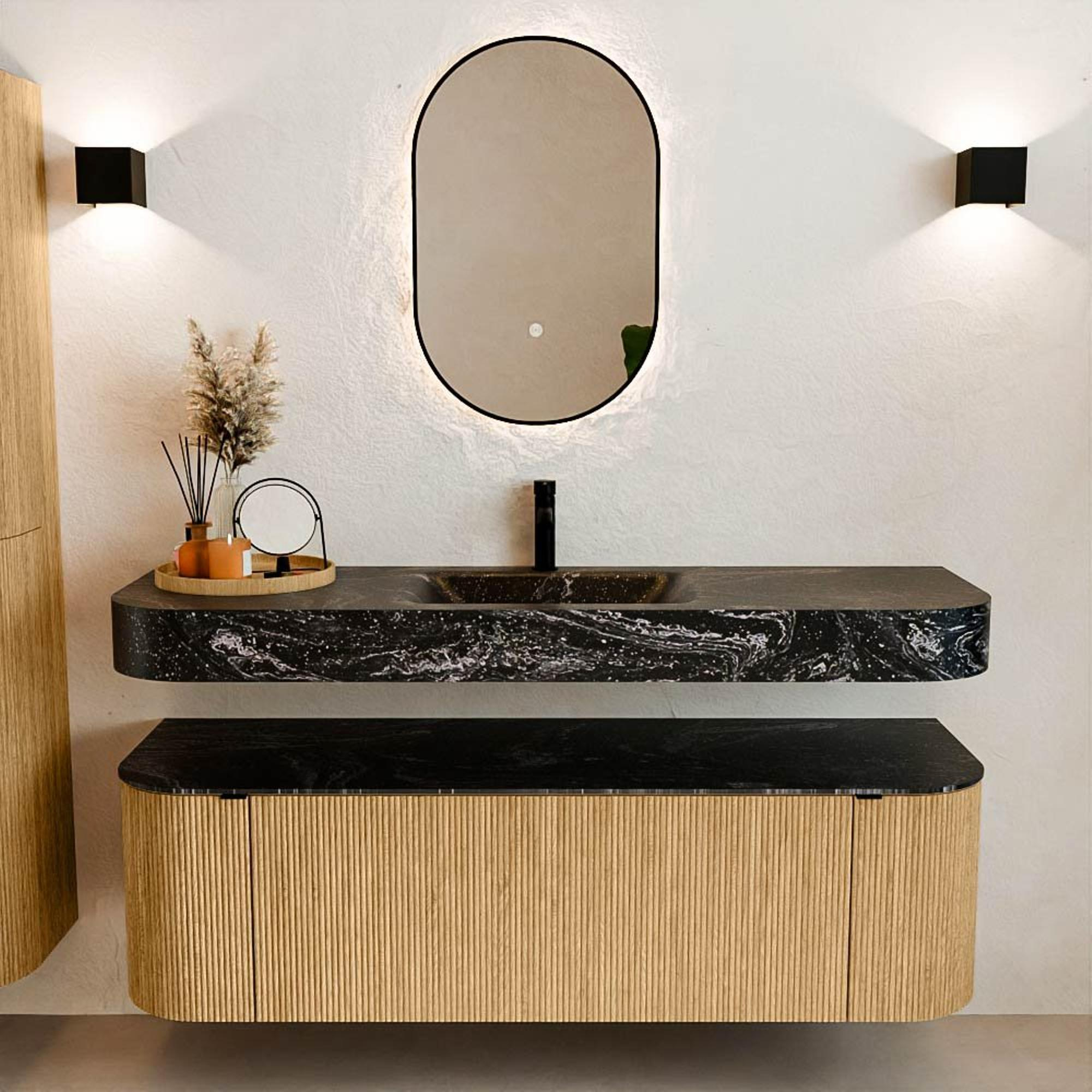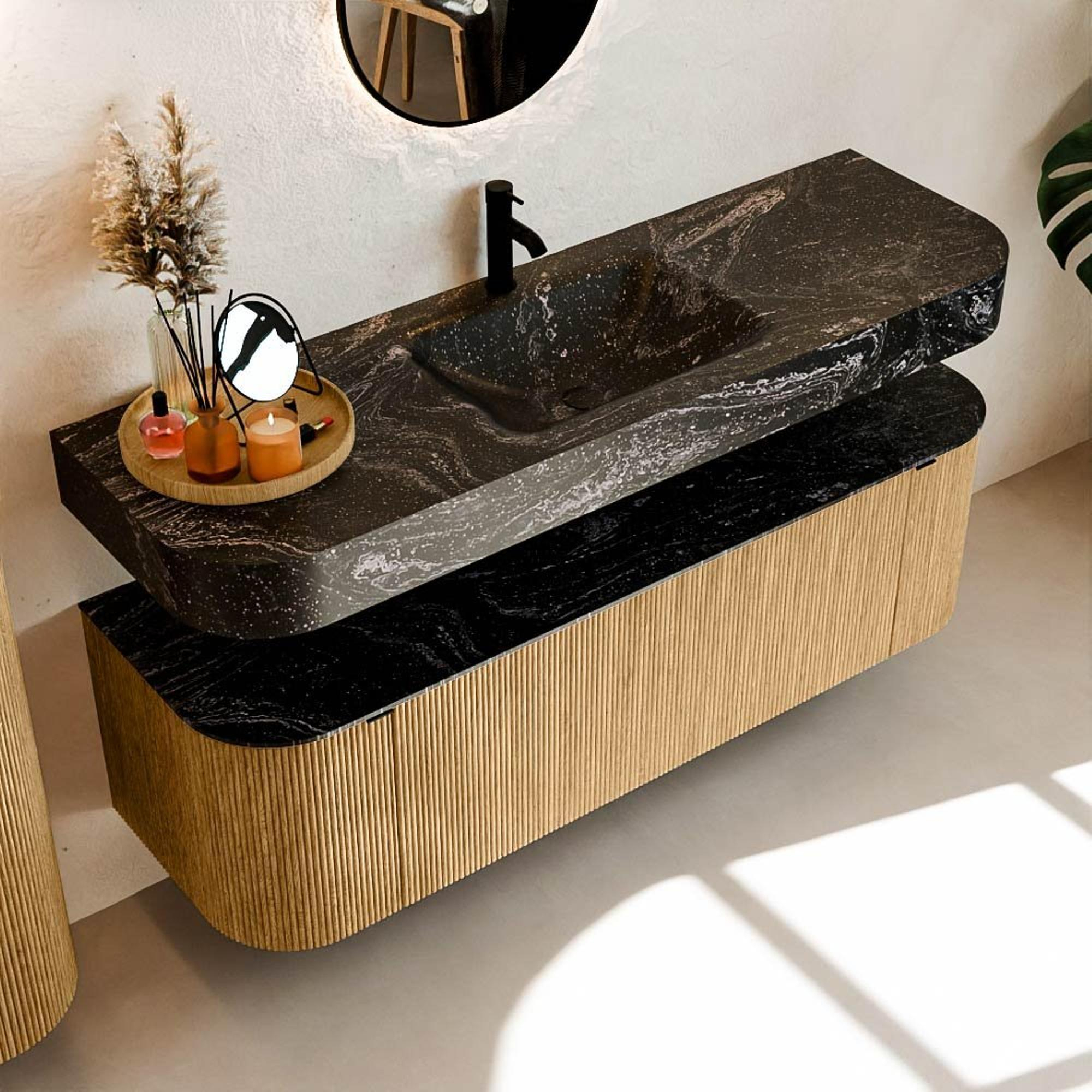 MONDIAZ THOR-DLUX 150cm meuble de salle de bains arrondi gauche + droite couleur Oak avec 1 tiroir et 2 portes. Vasque suspendue CLOUD Milieu 1 trou de robinet couleur Lava.