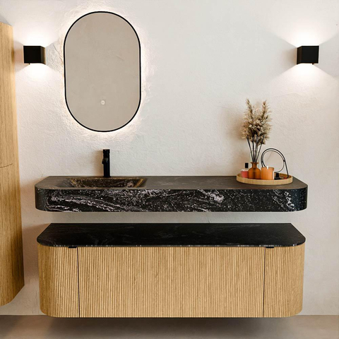 MONDIAZ THOR-DLUX 150cm meuble de salle de bains arrondi gauche + droite couleur Oak avec 1 tiroir et 2 portes. Vasque suspendue CLOUD gauche 1 trou de robinet couleur Lava.