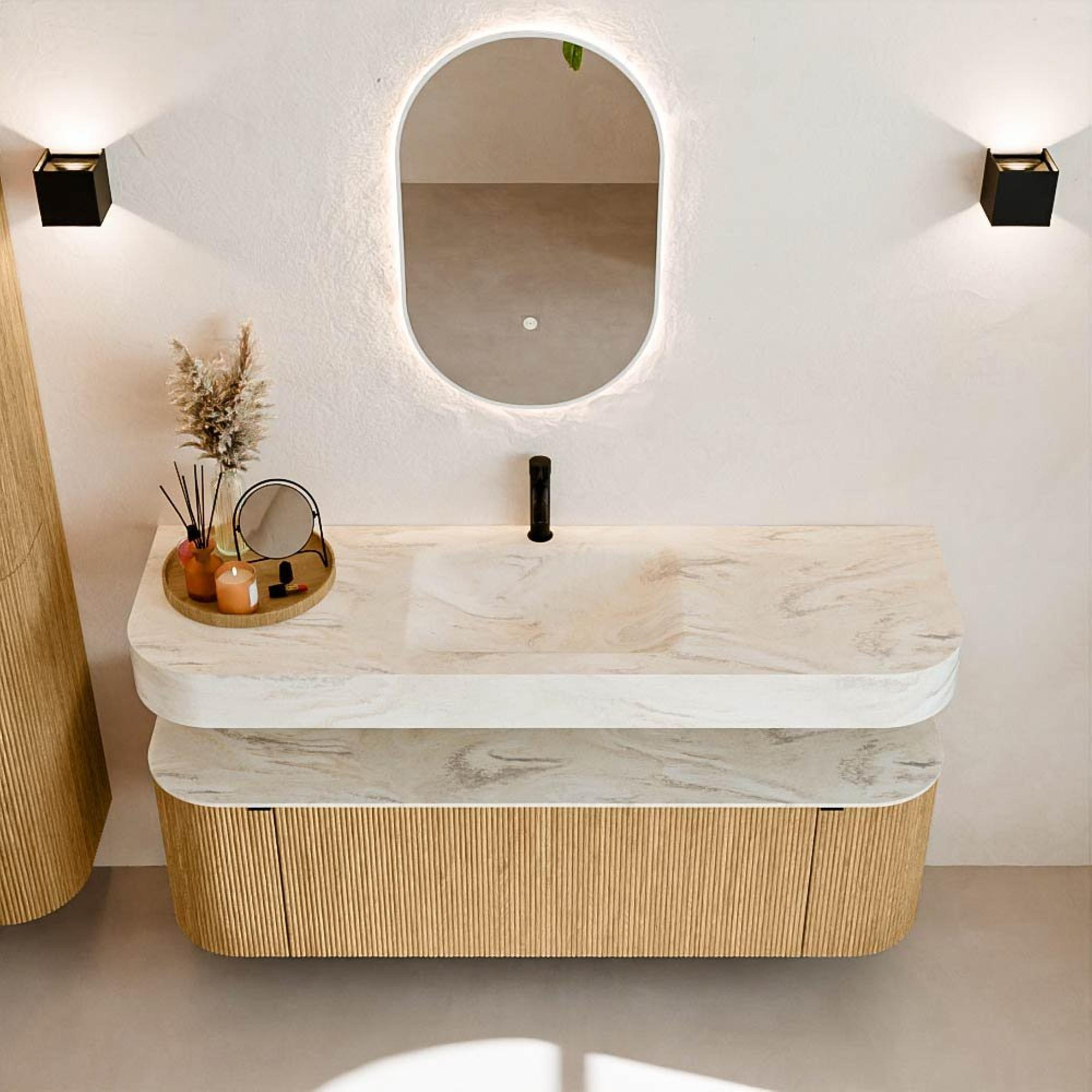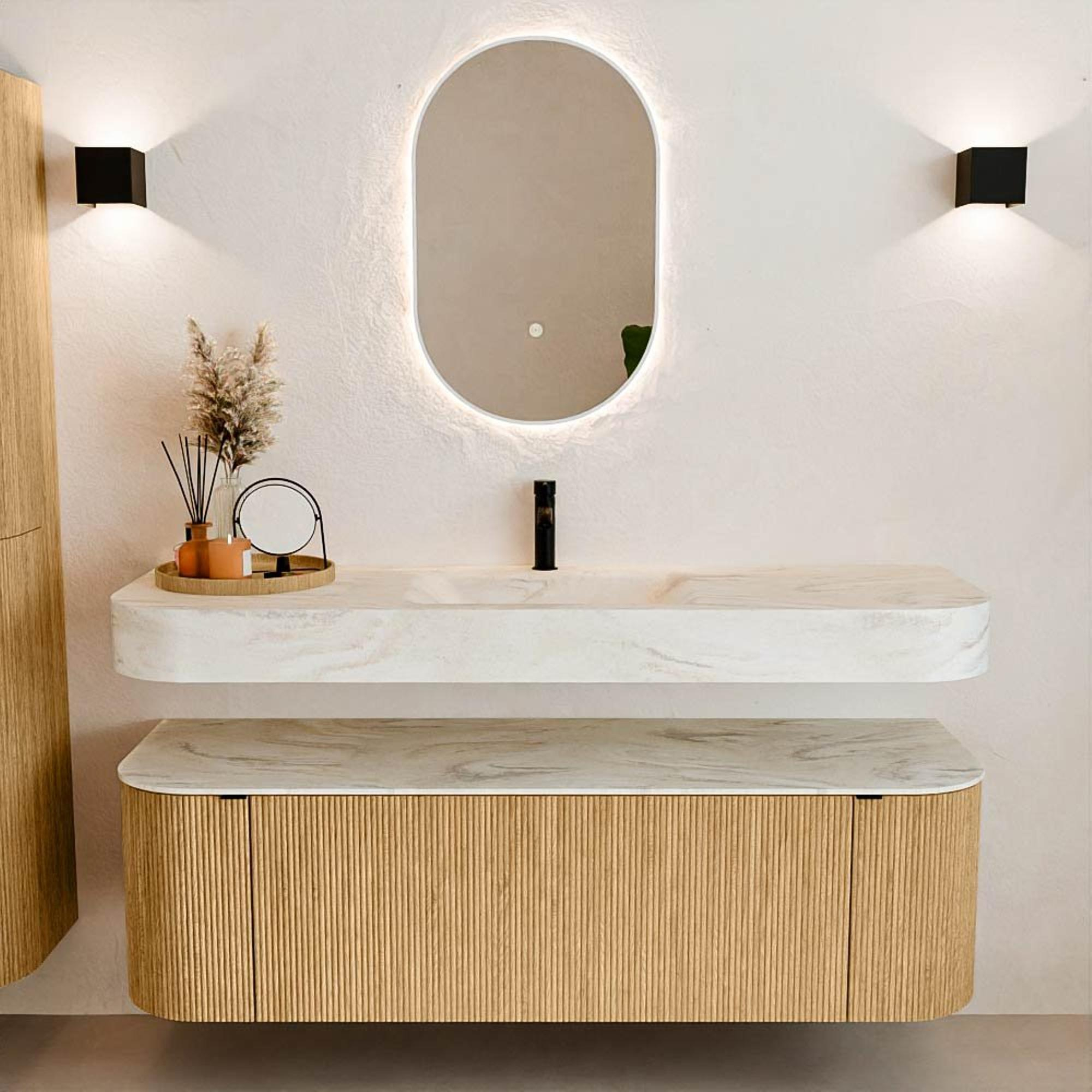 Au-dessus du meuble flotte une vasque suspendue assortie aux coins arrondis – parfaitement adaptée à la forme du meuble. La vasque est réalisée en Solid Surface et suit subtilement les lignes du meuble sous-jacent, créant un ensemble harmonieux. Le plan de travail en Solid Surface forme une base solide, facile d'entretien, et complète la combinaison.