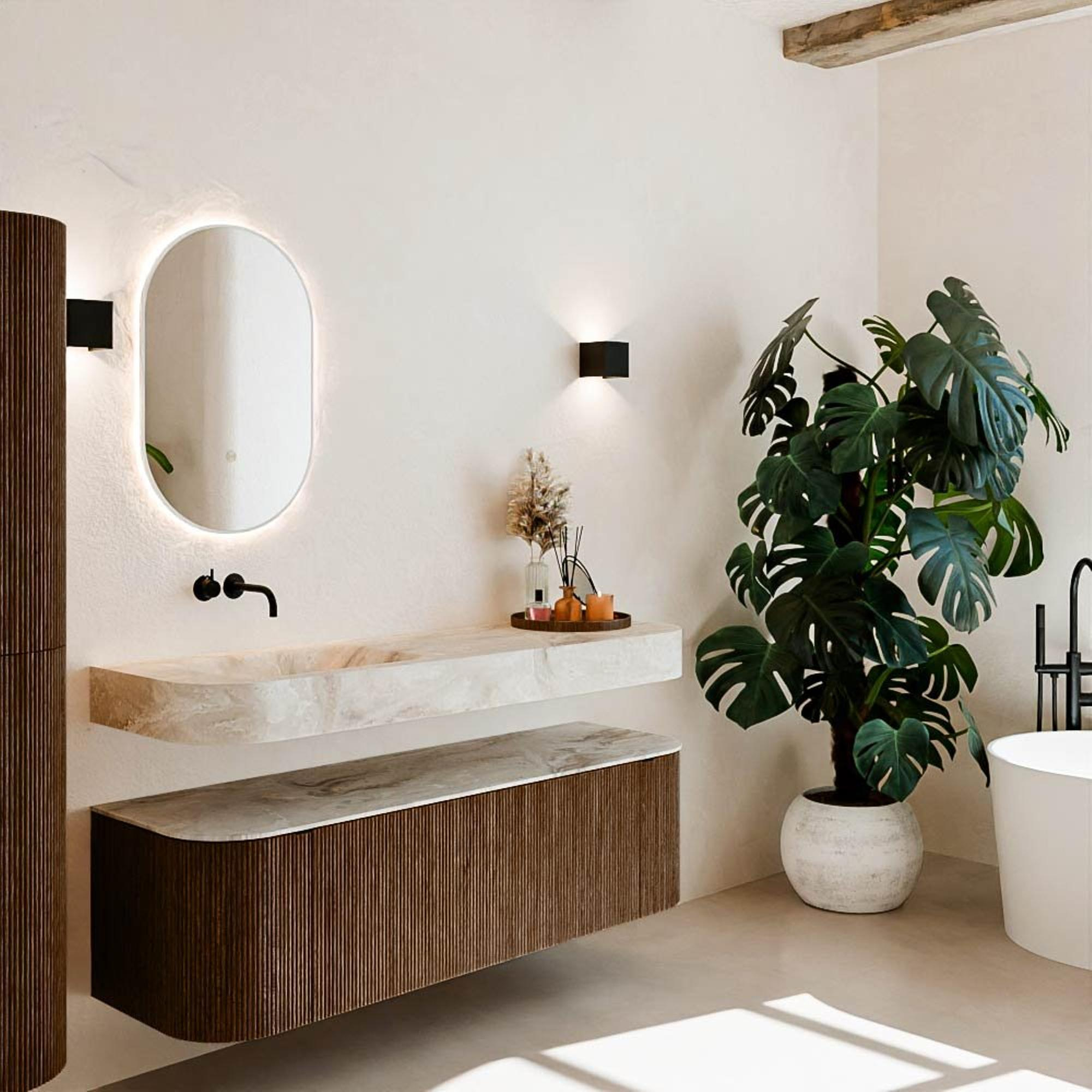 Matériaux naturels dans des tons chauds. Les nervures verticales apportent rythme et texture au design, tandis que le chêne confère une apparence chaleureuse et artisanale. Choisissez parmi 5 teintes de bois OAK, WALNUT, DUSK, SHADOW et RUBY, des couleurs de bois soigneusement sélectionnées pour enrichir les salles de bains modernes et classiques.