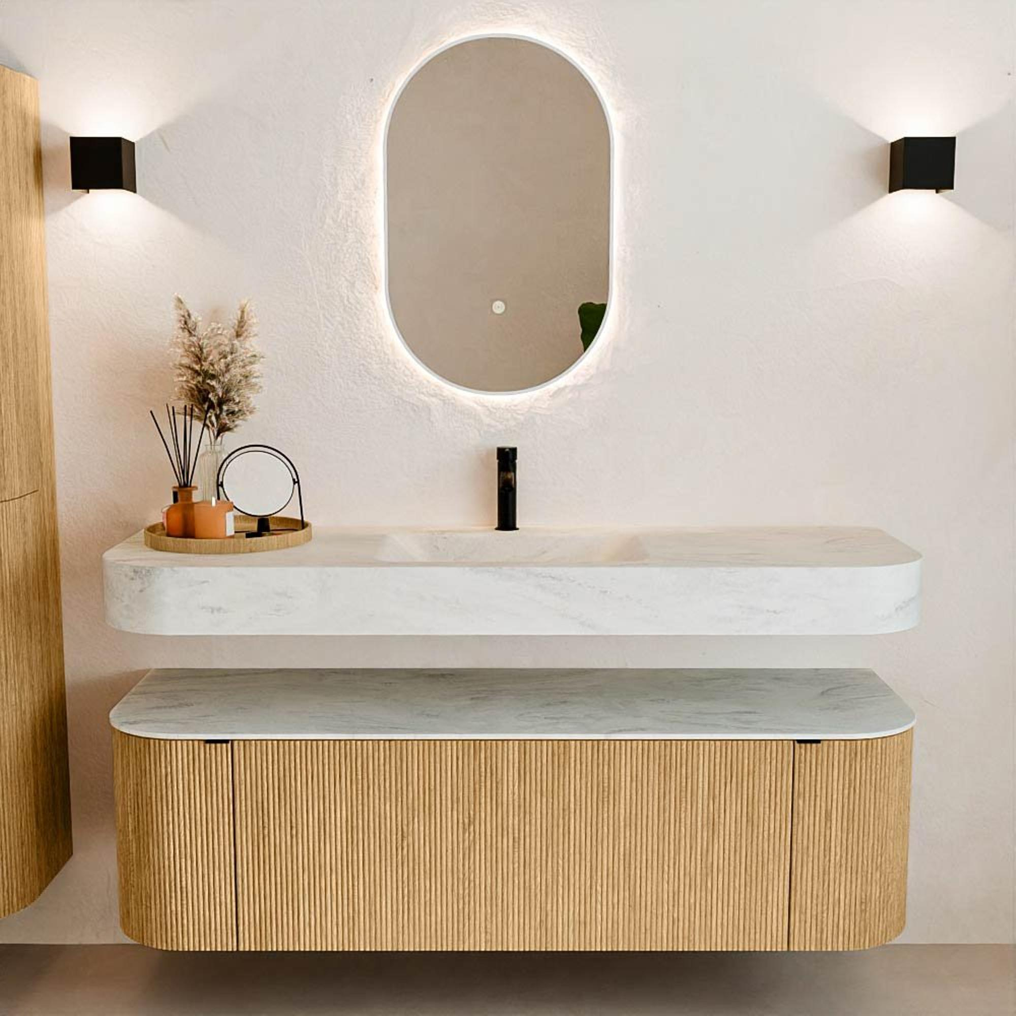 Au-dessus du meuble flotte une vasque suspendue assortie avec des coins arrondis – parfaitement adaptée à la forme du meuble. La vasque est réalisée en Solid Surface et suit subtilement les lignes du meuble inférieur, créant ainsi un ensemble harmonieux. Le plan de travail en Solid Surface forme une base solide, facile d'entretien, et complète la combinaison.