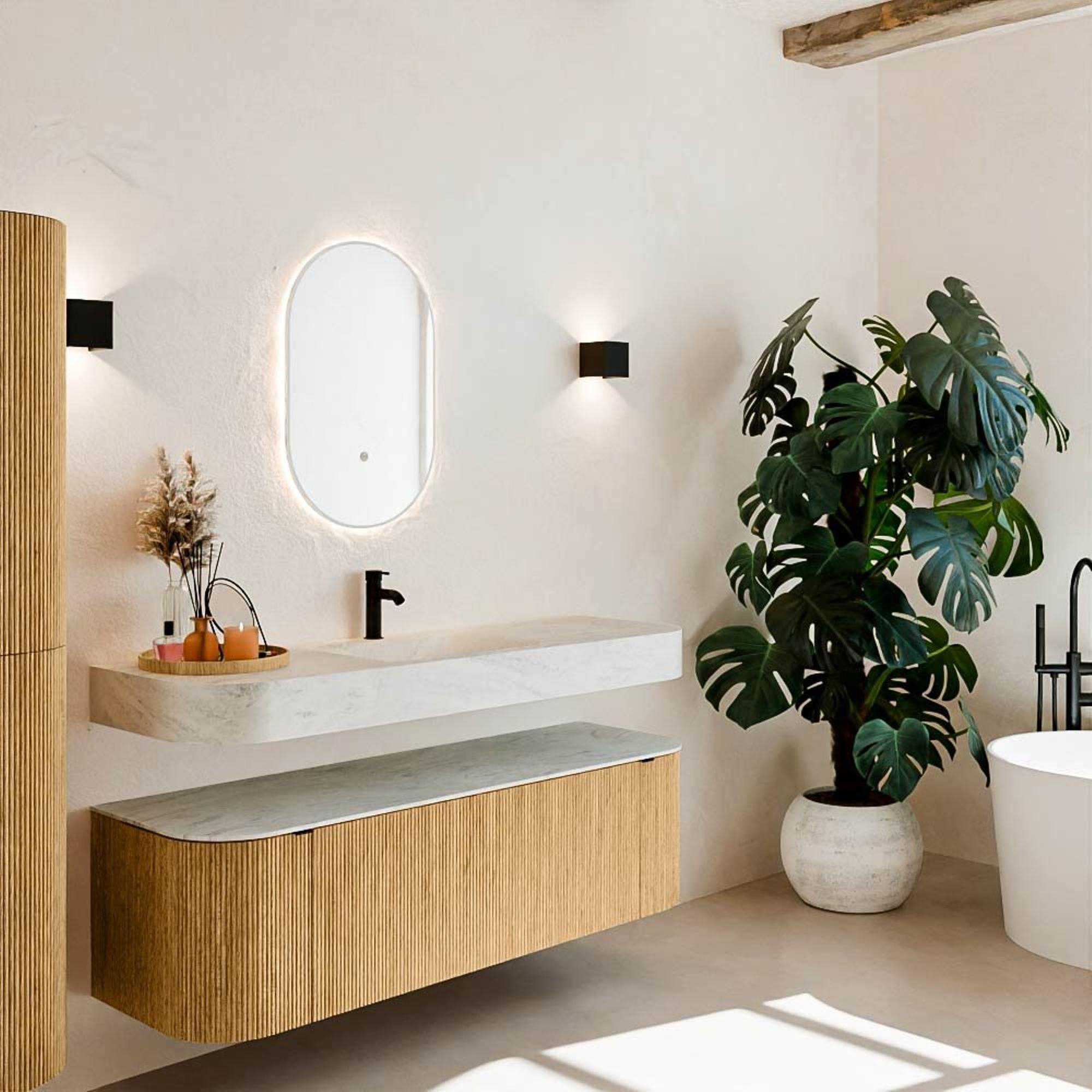 Matériaux naturels dans des tons chauds. Les nervures verticales apportent rythme et texture au design, tandis que le chêne confère une apparence chaleureuse et artisanale. Choisissez parmi 5 teintes de bois OAK, WALNUT, DUSK, SHADOW et RUBY, des couleurs de bois soigneusement sélectionnées pour enrichir les salles de bains modernes et classiques.