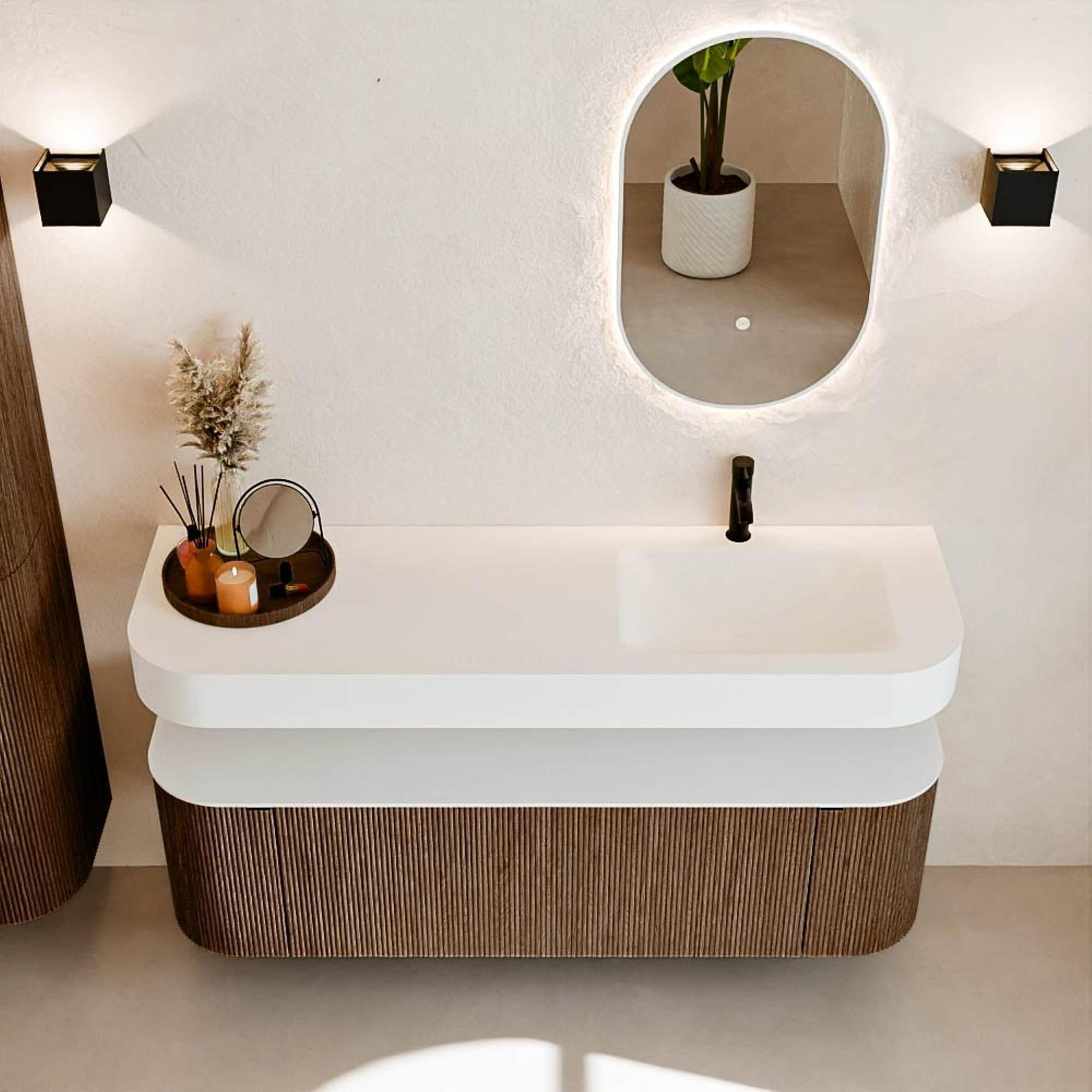 Au-dessus du meuble flotte une vasque suspendue assortie aux coins arrondis – parfaitement adaptée à la forme du meuble. La vasque est réalisée en Solid Surface et suit subtilement les lignes du meuble inférieur, créant un ensemble harmonieux. Le plan de travail en Solid Surface constitue une base solide, facile d’entretien et complète la combinaison.